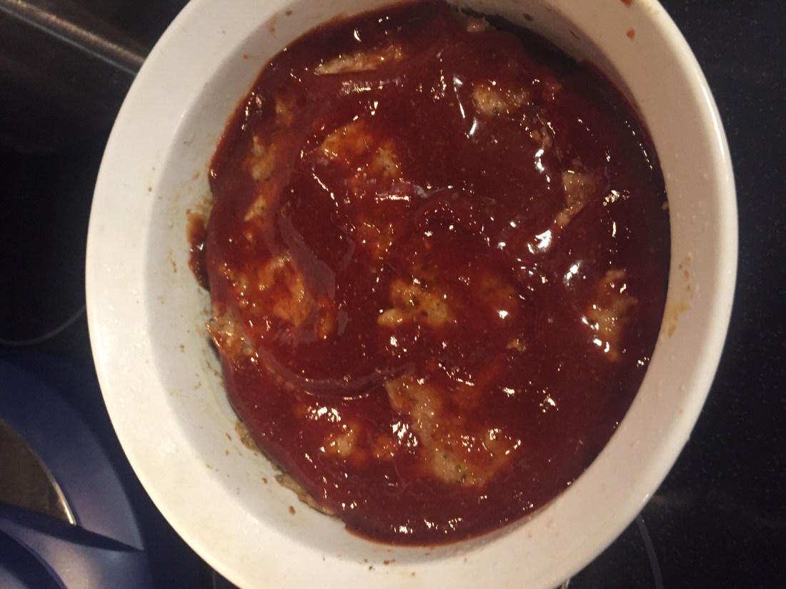 After you are done mixing, pat the meatloaf down flat into your ramekin. Now GO WASH YOUR HANDS! Lol