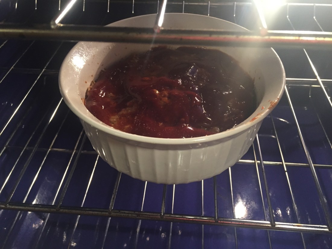 Once your meatloaf is done cooking, use those handy trivet handles and take the ramekin out of the instant pot. (I drain the grease into an empty glass jar that I save after we finish using the contents and when it’s full I just throw the whole jar away since they don’t recycle where I live and I’ve never seen recycling in campgrounds either). Using a spoon, smear your yummy barbecue sauce on top of your meatloaf.