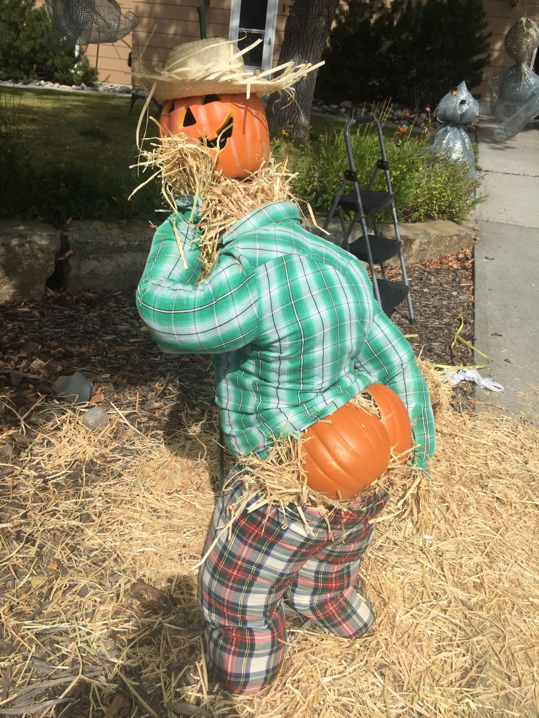Then the mailman stopped to deliver our mail and all our decorations are next to the mailbox and he was cracking up at the scarecrow! Said he was going to go home and make one just like ours. The best compliment in life is when someone copies your artwork lol. So go make a scarecrow! Get crazy! Have fun! Make your neighbors laugh! Laughter is healthy and our neighbors must be very healthy after watching our antics today.