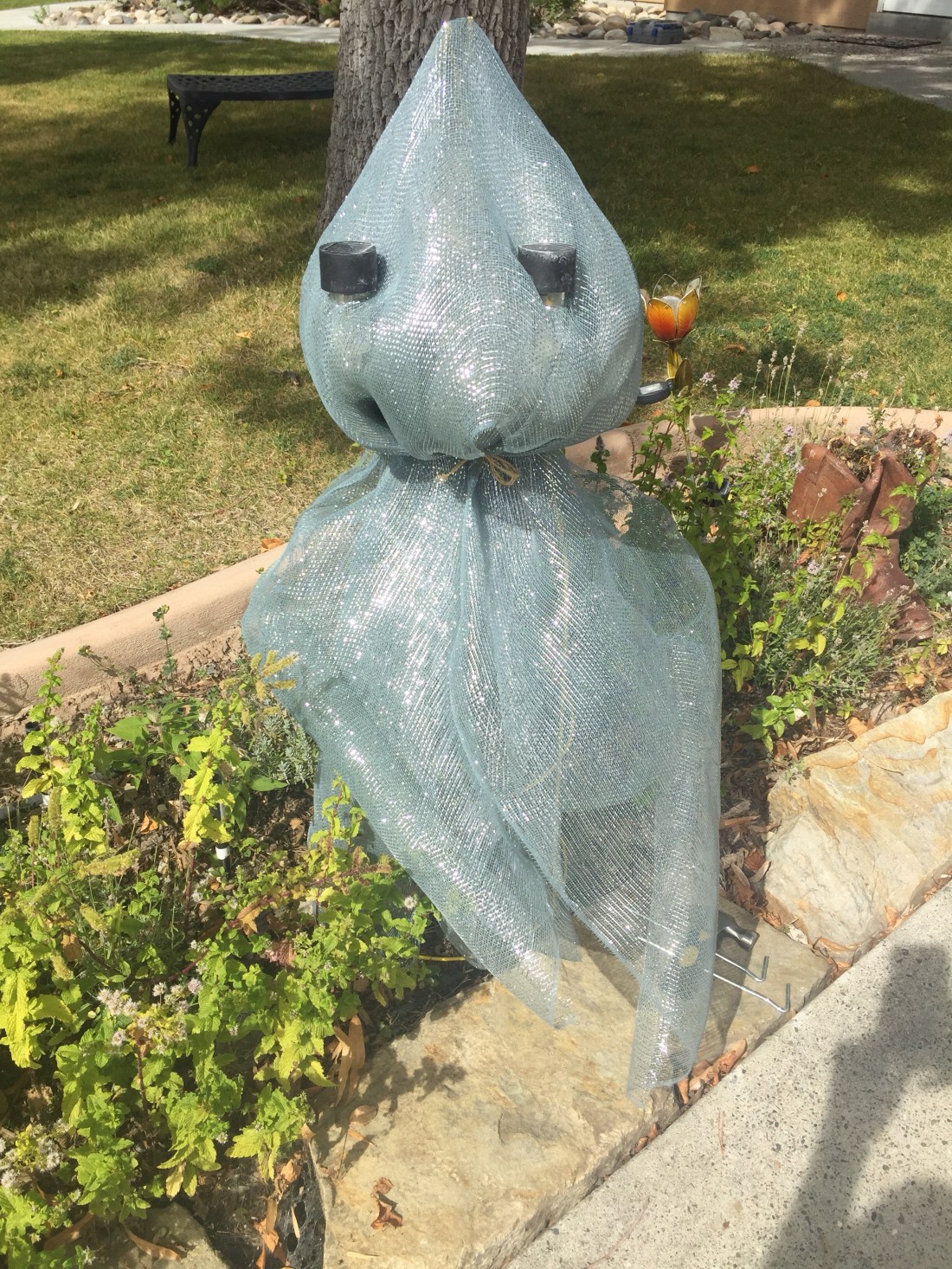 The we made our ghost (everyone else says it looks more like an alien and I’m cool with that too lol) by staking down a tomato cage upside down with tent pegs so it won’t blow away. Filled a plastic grocery sack with some straw, slide it on top, and tied it with the bag handles and then some twine so the straw won’t fall out. Then draped three rows of cloth over the body and tied around the neck area to hold it all together. A couple of snips with the scissors and we had an easy spot to insert the tops from some solar lights to make him glow at night… the material is a sparkly silver loose weave burlap type so it should light up nicely. It sparkles great in the sunlight!
