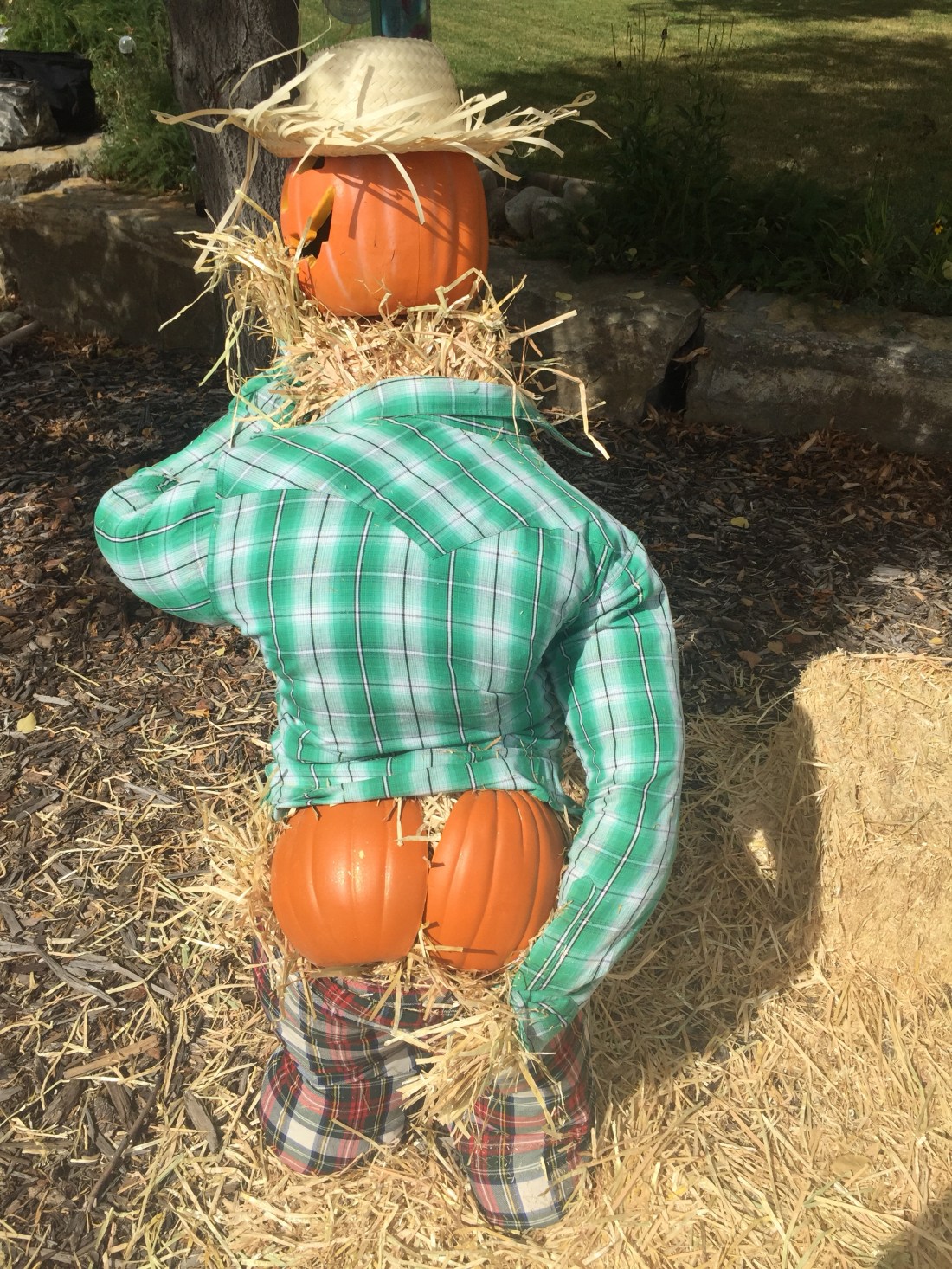 First we made this hysterical scarecrow. The neighbors were out and since the scarecrow was mooning their house we made sure to tell them it wasn’t meant for them in particular lol. We used garden stakes and then placed the clothes over the garden stakes and stuffed them with straw. Drilled a hole in the pumpkin to slide it down over the garden stake so it doesn’t blow away. Same with the hat. We used 3 garden stakes total. Two for the legs and one to hold up the head and body (and a few zip strips and twine).