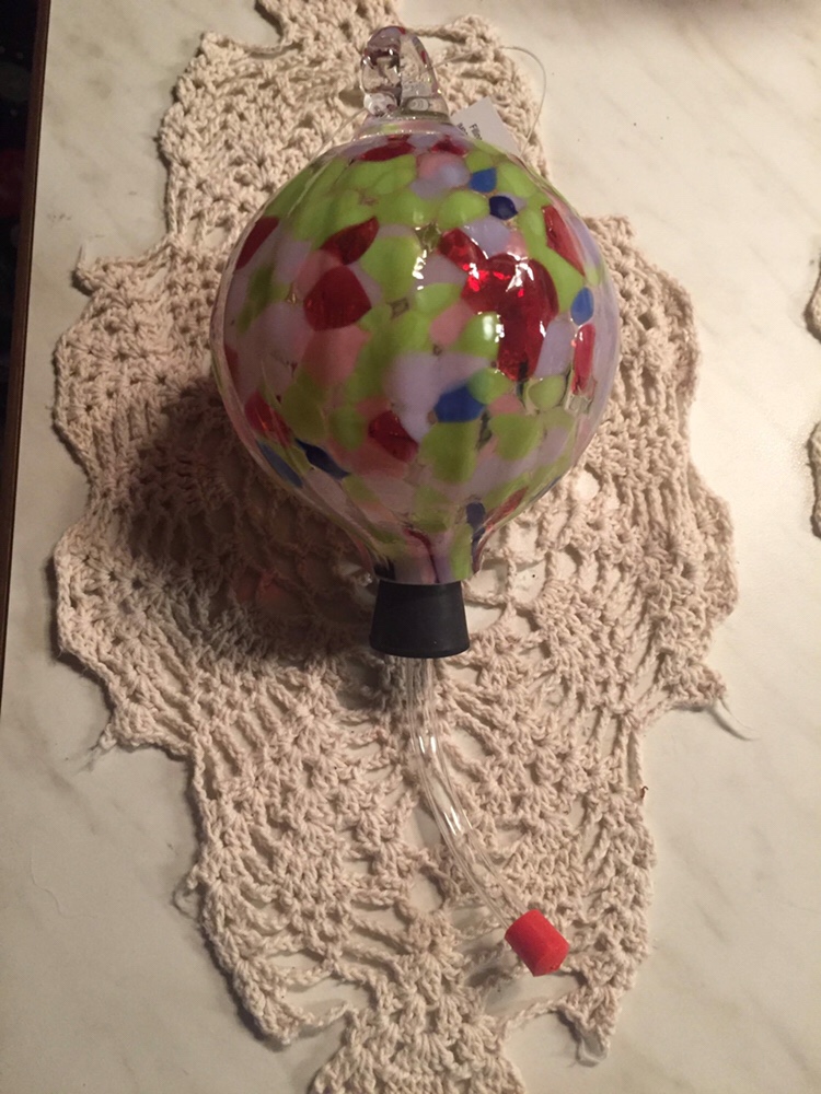 And since my neighbor was kind enough to keep an eye on our house while we were traveling and she has the most gorgeous flower garden I have ever seen!!!!! I decided to bring her back a little souvenir π this beautiful hand blow glass humming bird feeder. She was thrilled with her gift and it is on prominent display in her flower garden now.