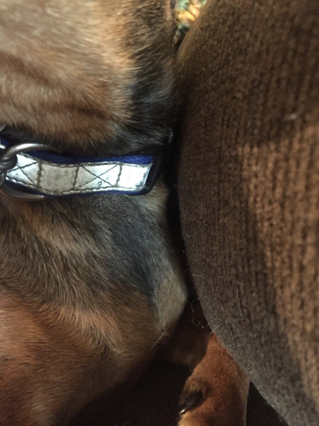 So the human approves this emergency leash for wearing on the collar for larger dogs with longer fur. For lil bit who has short fur it rubbed her neck to the point of irritation and fur loss so I had to remove it from her collar. No worries I just keep it on my keychain or in my purse or pocket or on my belt loop as an extra back up. She hardly has any fur on her neck in the first place being a short hair 20 lb mini pinscher chihuahua mix… so this just wasn’t the right product for her particular body. Just because it wasn’t a good fit with her body type doesn’t mean it isn’t useful. I’m still happy I bought two. I just adapt how I carry it. What if we are out walking and a leash breaks? I have a spare on my keychain. See what I mean…