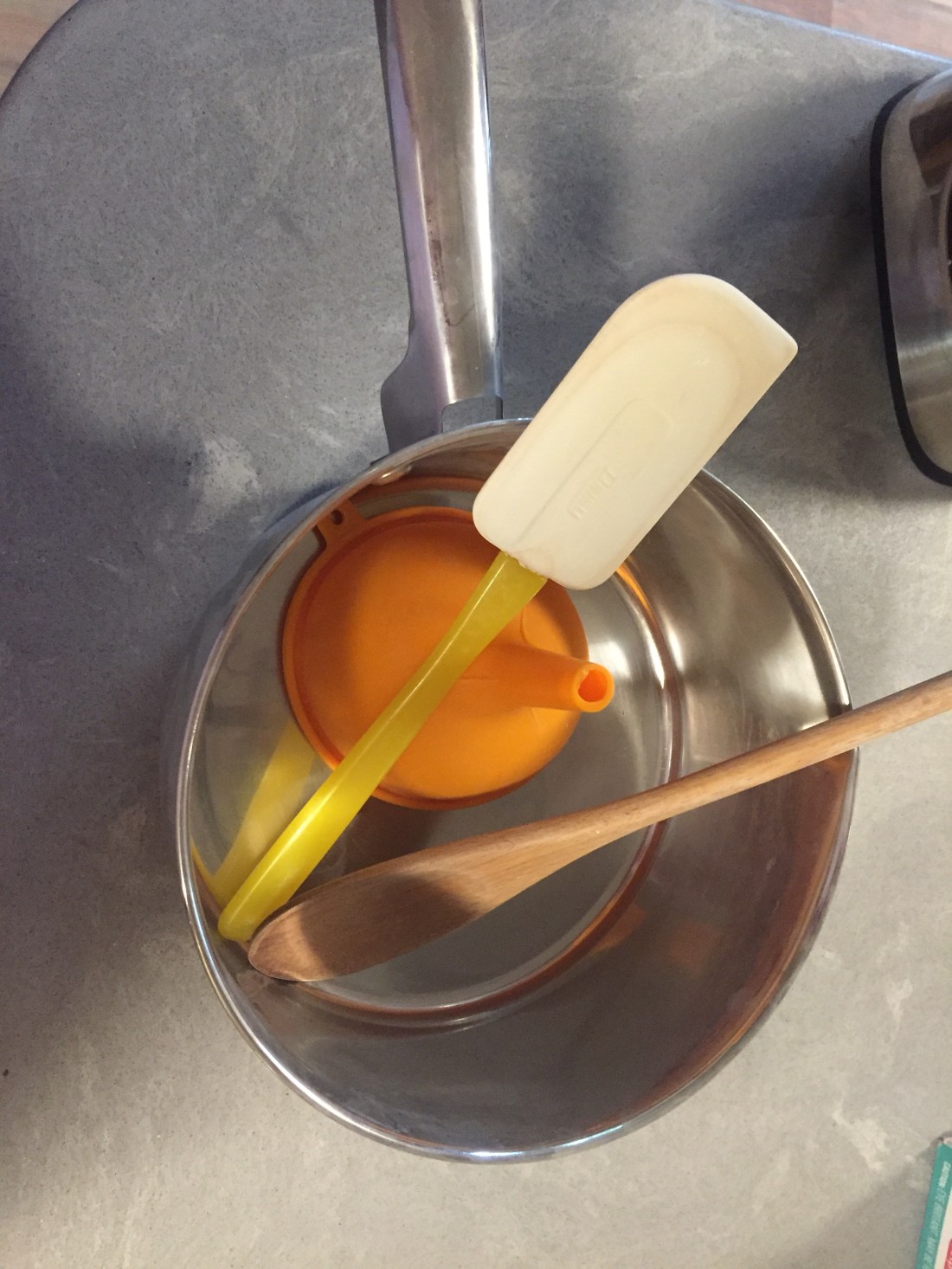 So I’m not going to go over the actual recipe because budget101 website does a wonderful job with their recipe instructions. I will however show you some photos of my “equipment”. I purchased all my pots and pans and spoons and blender etc to make this laundry detergent at the thrift store and keep them separate from my regular (food) cooking utensils. I store mine in the laundry room and I have tons of room to store them because I don’t have a huge bottle/box etc of commercial soaps taking up all my space. I just have two quart size canning jars and they last me about 6 month! A bottle of vinegar, a small bottle of softener, another quart jar of dryer sheets, a bag of baking soda (for my other DIY cleaning recipes and occasionally I use some in the laundry), a bottle of “shout” and my spray bottle of homemade all purpose cleaner/air freshener … are the only other things on my laundry room shelf! So plenty of space!