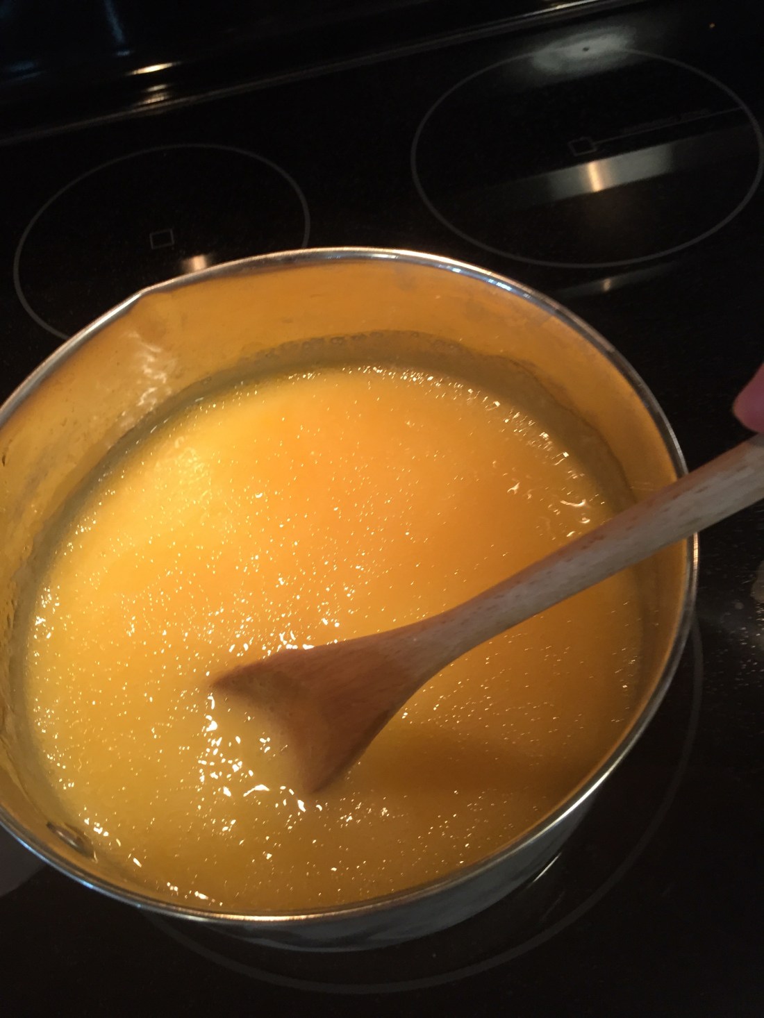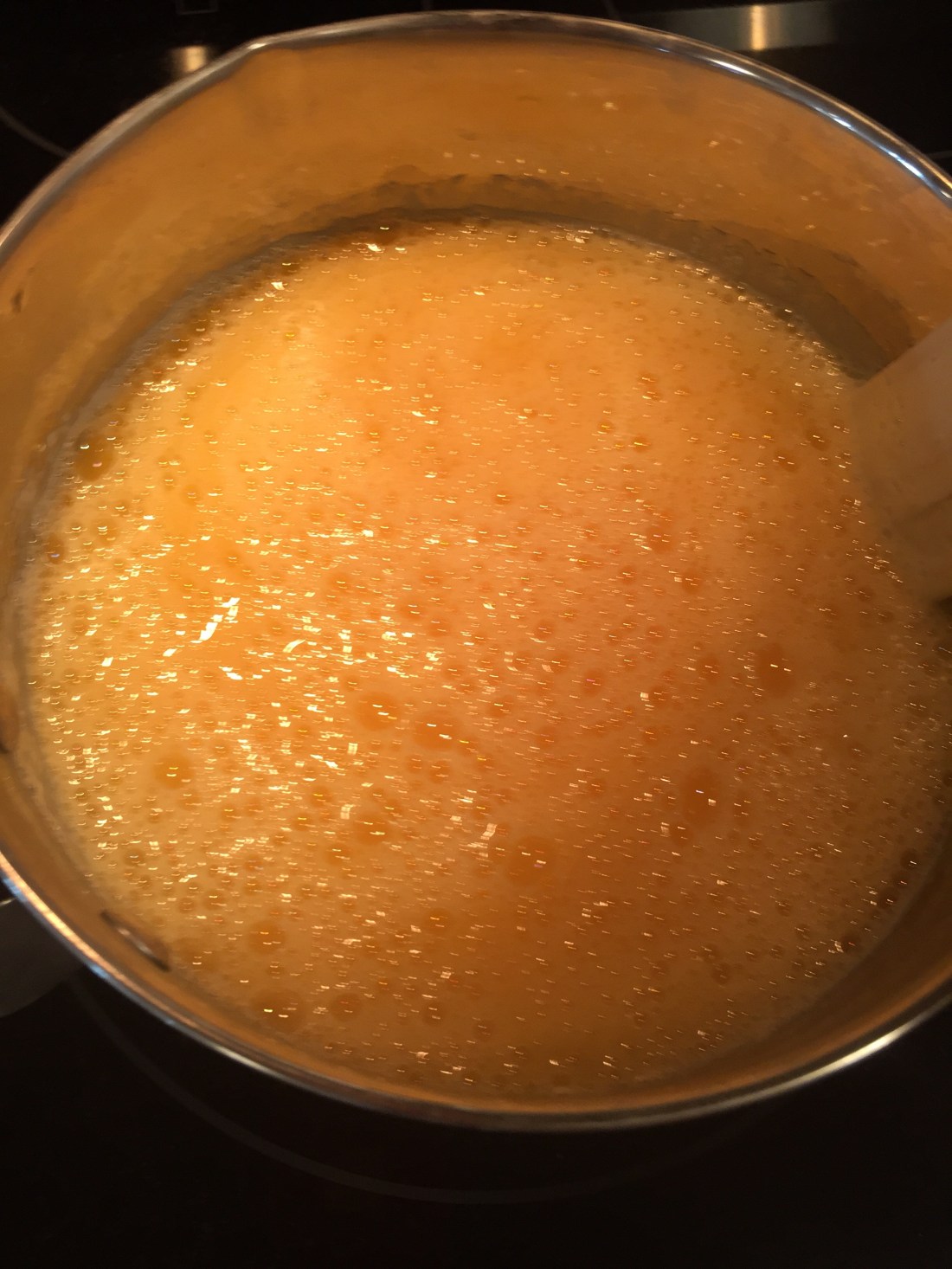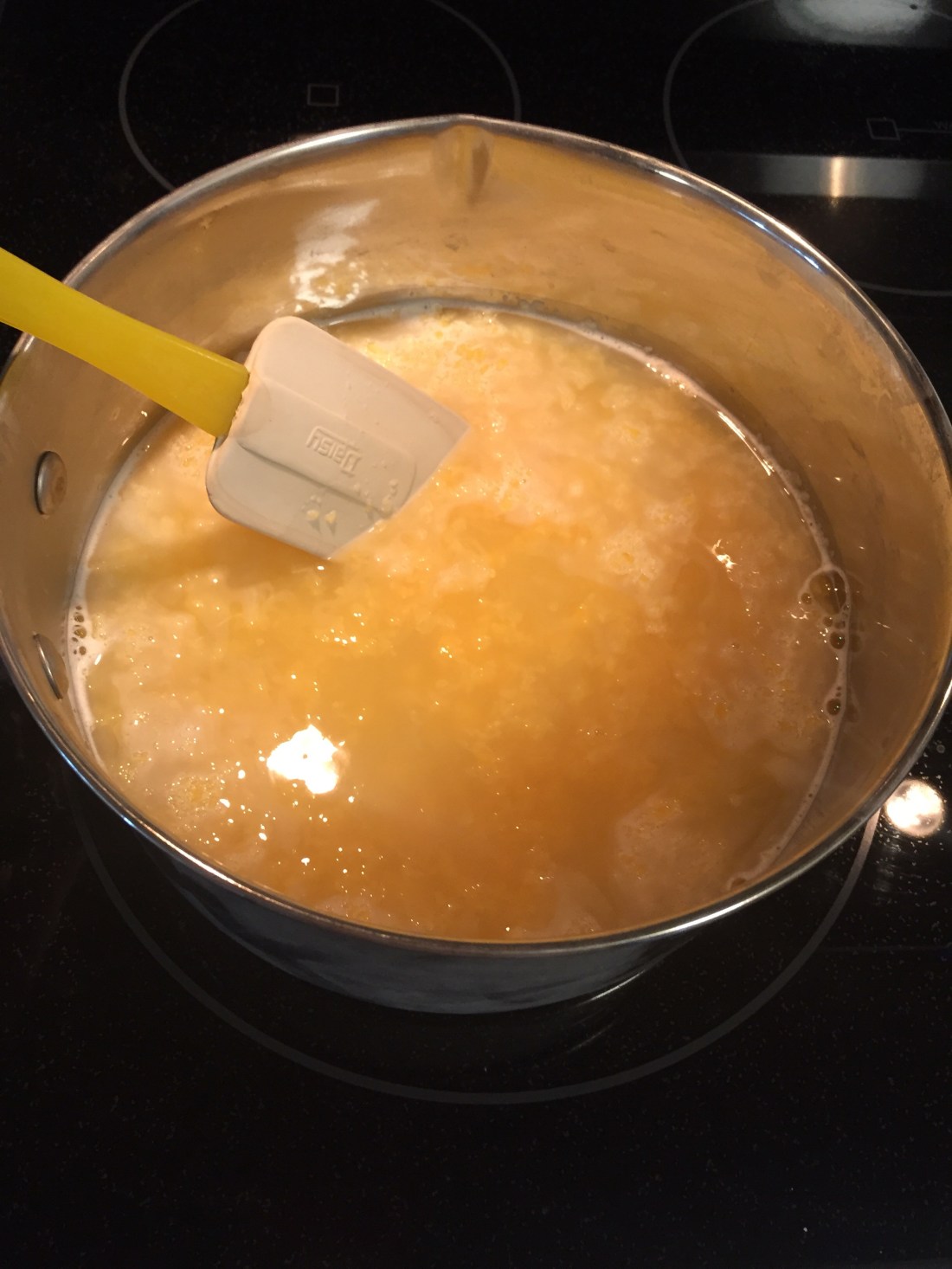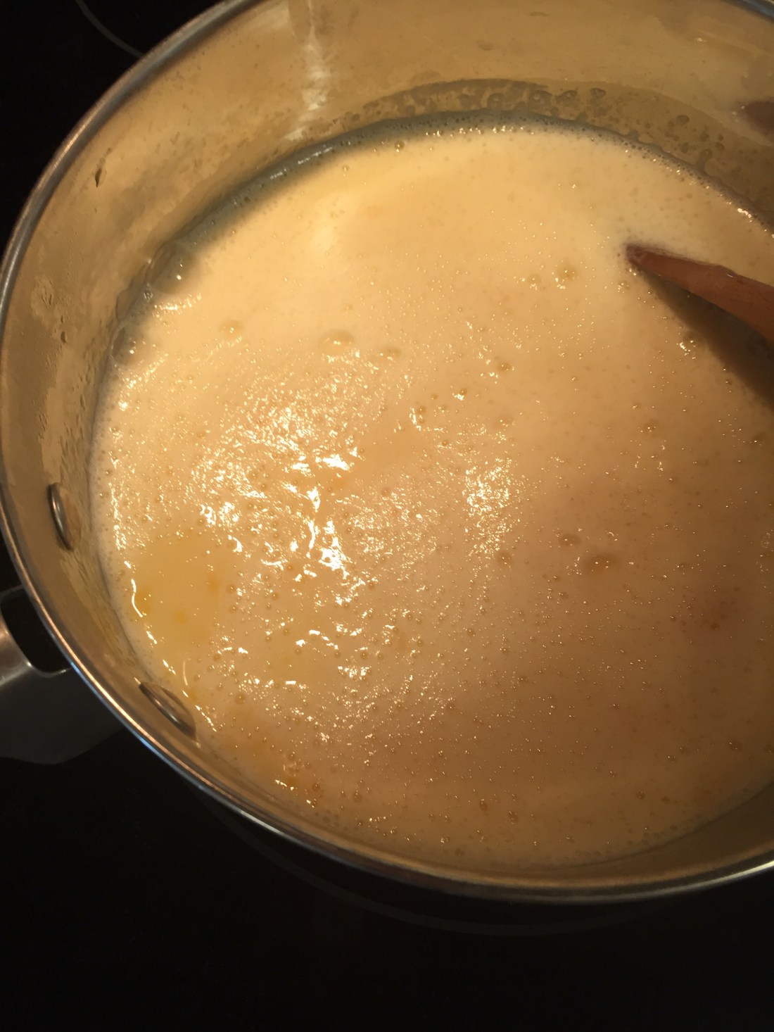 This part requires low heat and gentle non stop stirring. Hence the importance of having everything lined up before you start. It will go from yellow to a creamy color. Adjust the heat down as you go so that it doesn’t boil and foam over. I had to switch over to my wooden spoon to get the dry ingredients mixed in well because they tend to stick to the bottom when you add them in.