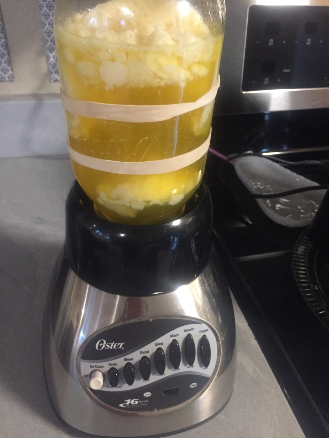 I use the long handle of the wooden spoon inserted in the jar like a knife to break up the large (but relatively soft) clump that forms in the jar after cooling… just break it up a little bit (i slowly poke a hole in the center all the way thru and then I slowly cut it into quarters using the spoon handle like a knife. I go slow so soap doesn’t slip out the sides and make a mess) before I put the jar on the blender. You probably don’t have to do this, but that’s what I do. I found with my blender it seems to help it blend easier. Yours may be different tho.