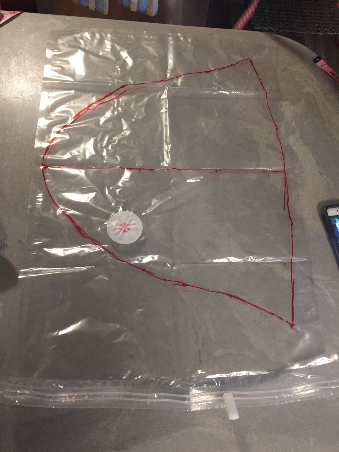 We are using the dollar store vacuum seal bags to draw and then cut out the inner template for our initial felting since this is a thick plastic, was only a dollar lol, and was perfect size to make our template! We will dispose of the side with the white plastic hose attachment part. We only need one side of the bag anyway.