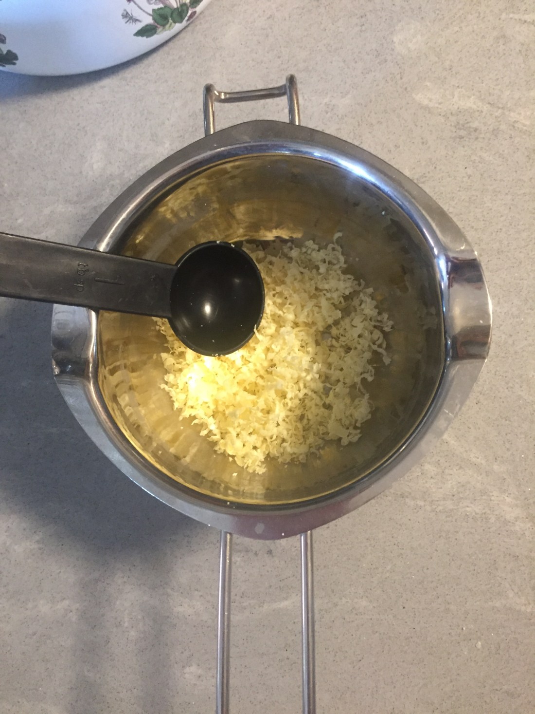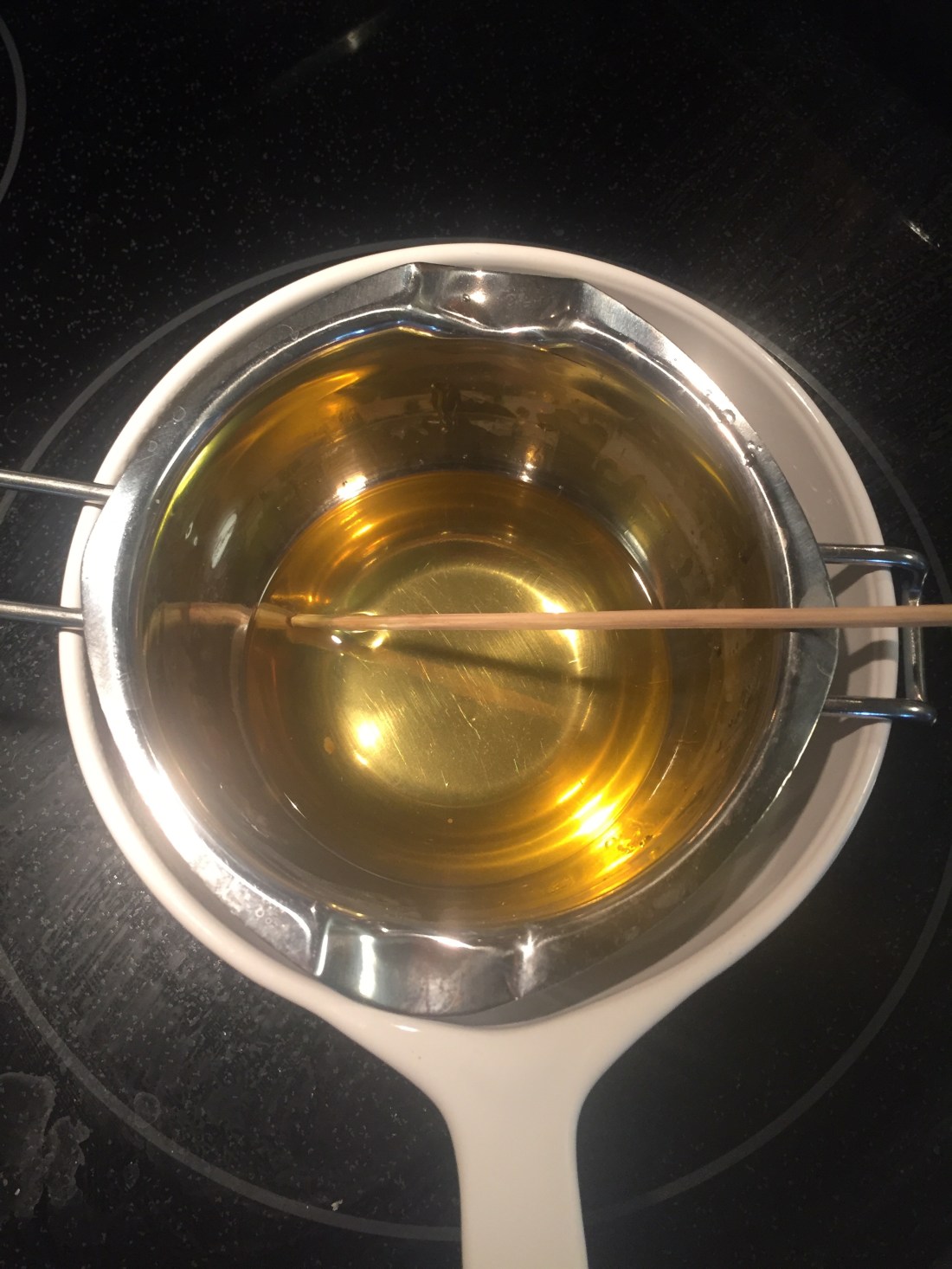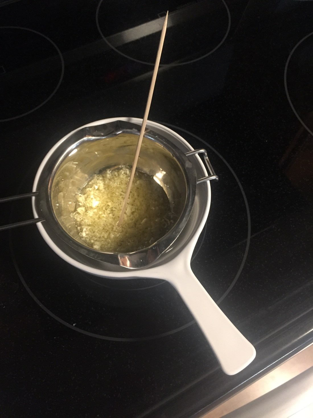 This is enough to make one small jar and because my small double boiler pot is so tiny, I do a second batch for the second jar. If you have a larger doubler boiler feel free to double those amounts. I like small batches because a little really does go a long way! Also the smell of beeswax being freshly shredded is just amazing BTW! So buy local and shred it yourself on a cheese grater if possible š I also like to use wooden kabob sticks or chops sticks for stirring when making homemade items. Trying to get cooled beeswax off a spoon can be difficult lol.