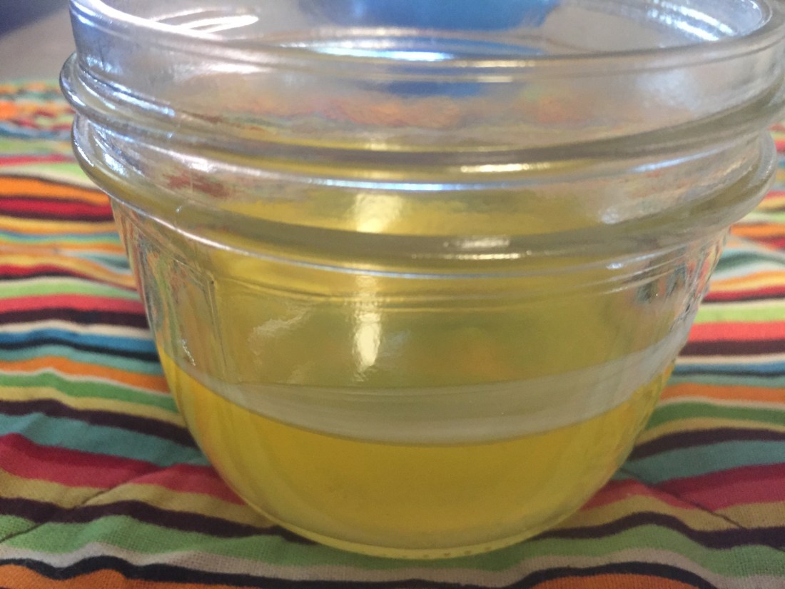 Again because my double boiler set up is tiny, I usually just take the re melted liquid and separate it in half between two (pre-warmed) jars (unless the jar I’m using has enough room to add more olive oil after re melting) and “eyeball” how much extra olive oil I want to add (less is better, as I can always re melt and add more as needed) … and let it cool again. I usually give it a sniff and if I can’t smell the oregano scent I will add a few more drops of oregano oil as well. (Again a tooth pick or kabob stick or chop stick to give it a quick stir helps). Be careful not to add more than 20 drops total tho, because the oregano oil is typically very strong and can burn skin if you don’t dilute it enough.