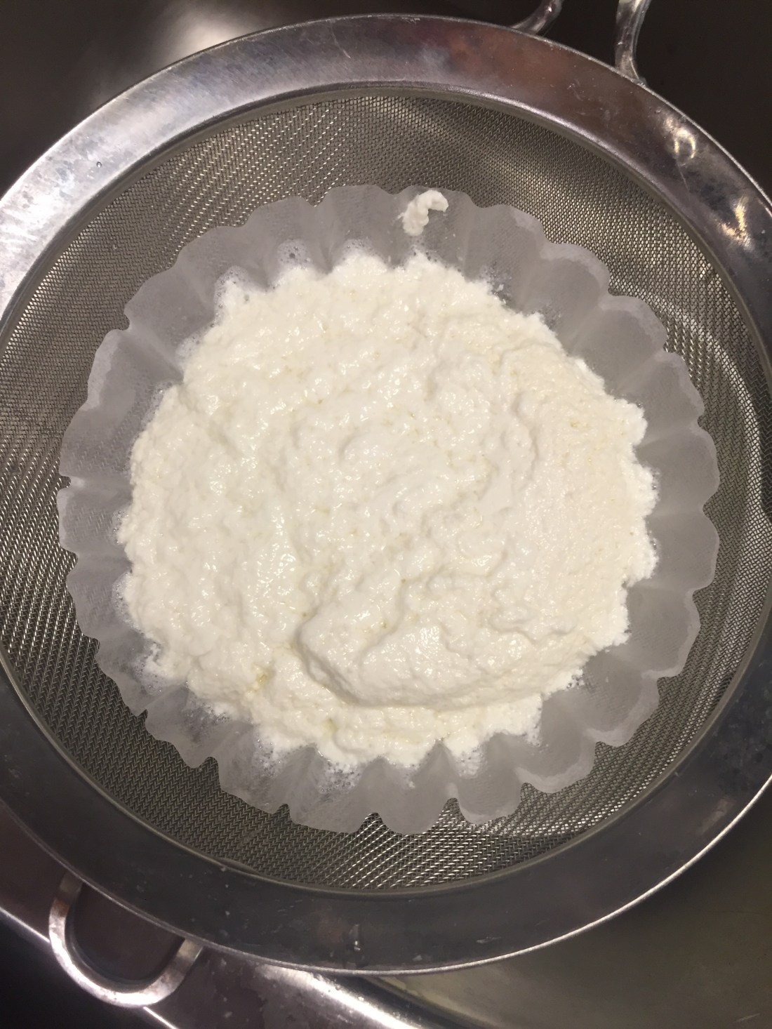 Once it finished steaming for 10 minutes, the curds separated from the whey and they were all floating on top, so I used a scoop to scoop out the curds and placed those in a sieve lined with a coffee filter to let it drain (capturing the whey in a pot under the sieve). Save that whey! It’s excellent to use instead of water in bread making (hmmmmm I may use some whey in those cookies tomorrow!)