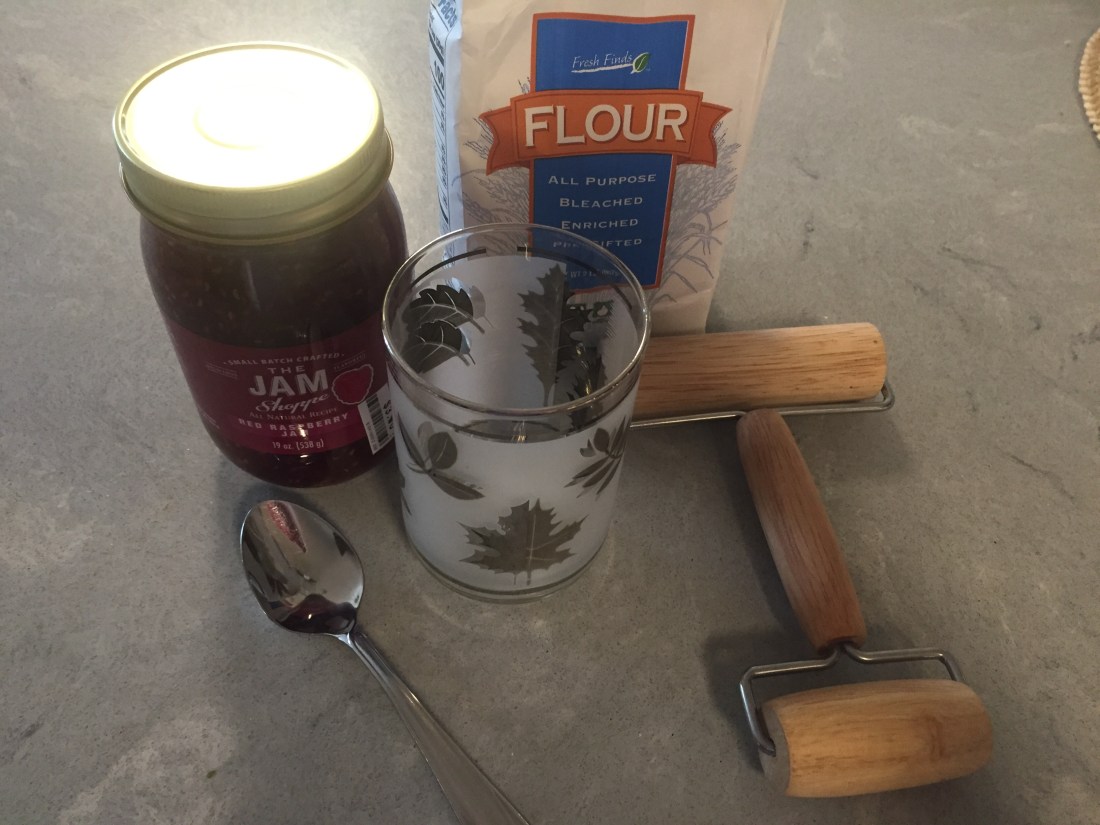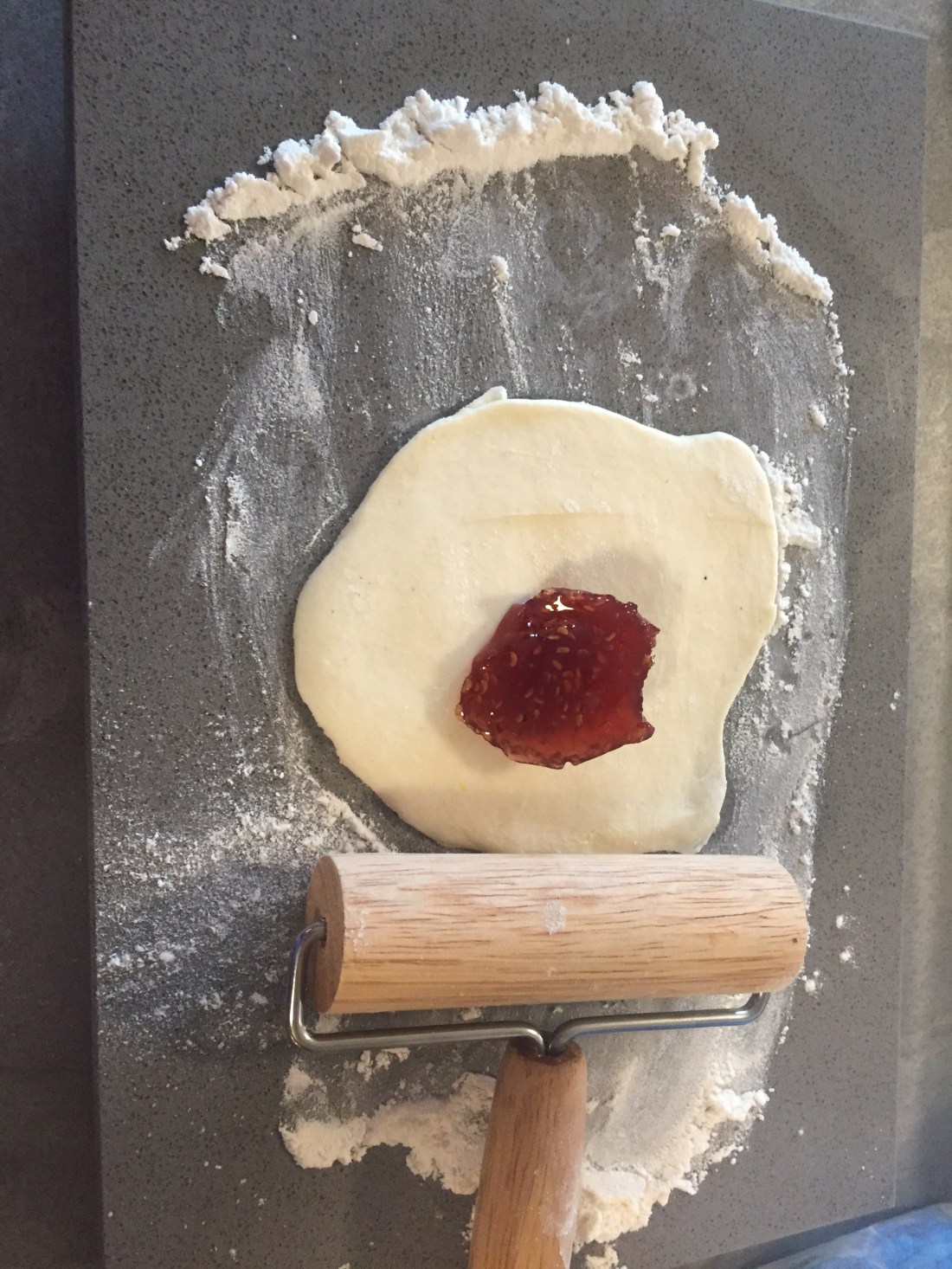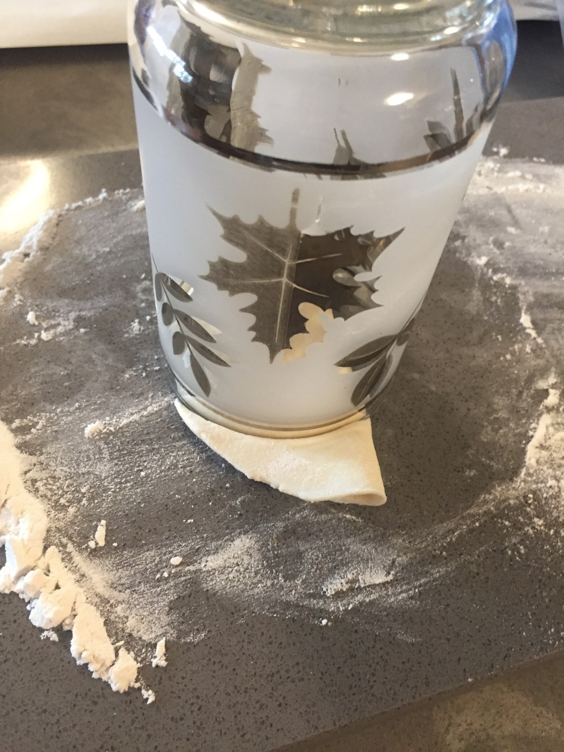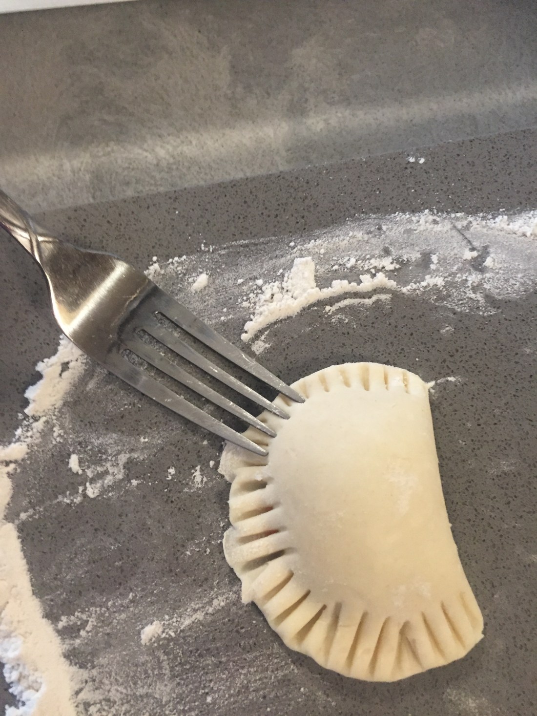 Back to the dough! After chilling the dough should be nice and stiff. You can roll it out and get fancy if you want… but I’m going to do it like my mamaw! Grab a small ball of dough, pat it flat, (roll it with the pastry roller if you have one) put a spoon full of jam in the middle, fold in half, use a small drinking glass to cut the edges in a circle, and use a fork to smoosh down the open sides.