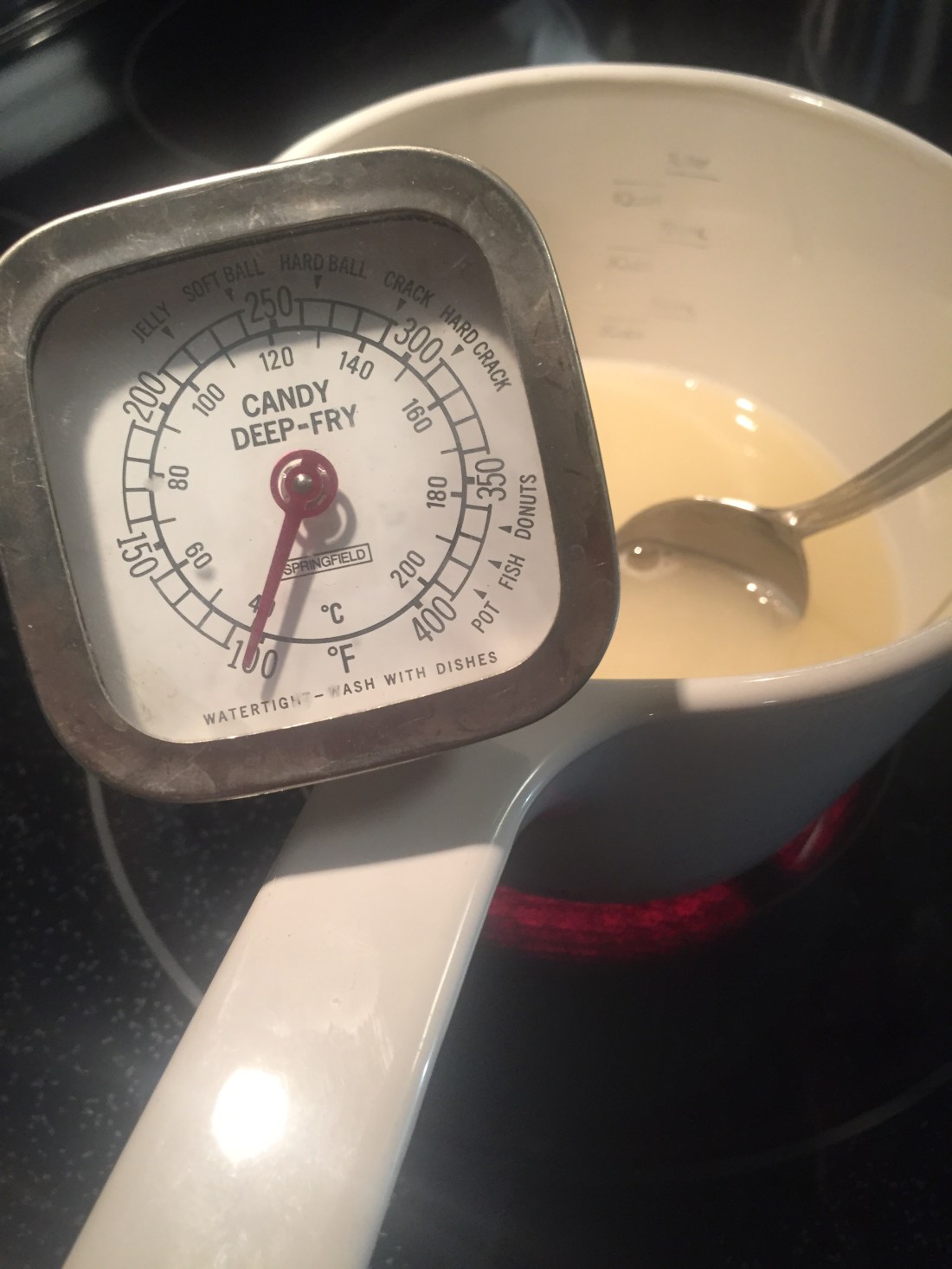 For my recipe today I am using: 1 cup white sugar, 1/3 cup lemon juice (because that’s all I had left in the fridge lol), and 2/3 cup water (to make a 1:1 ratio). I’m also using my wonderful vintage corningware with a pour spout to make it easier to pour into my molds (and corningware is super easy for clean up afterwards). A candy thermometer is handy too!