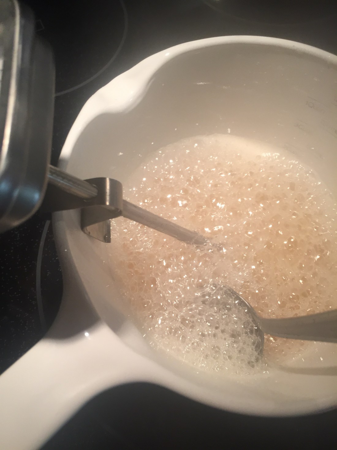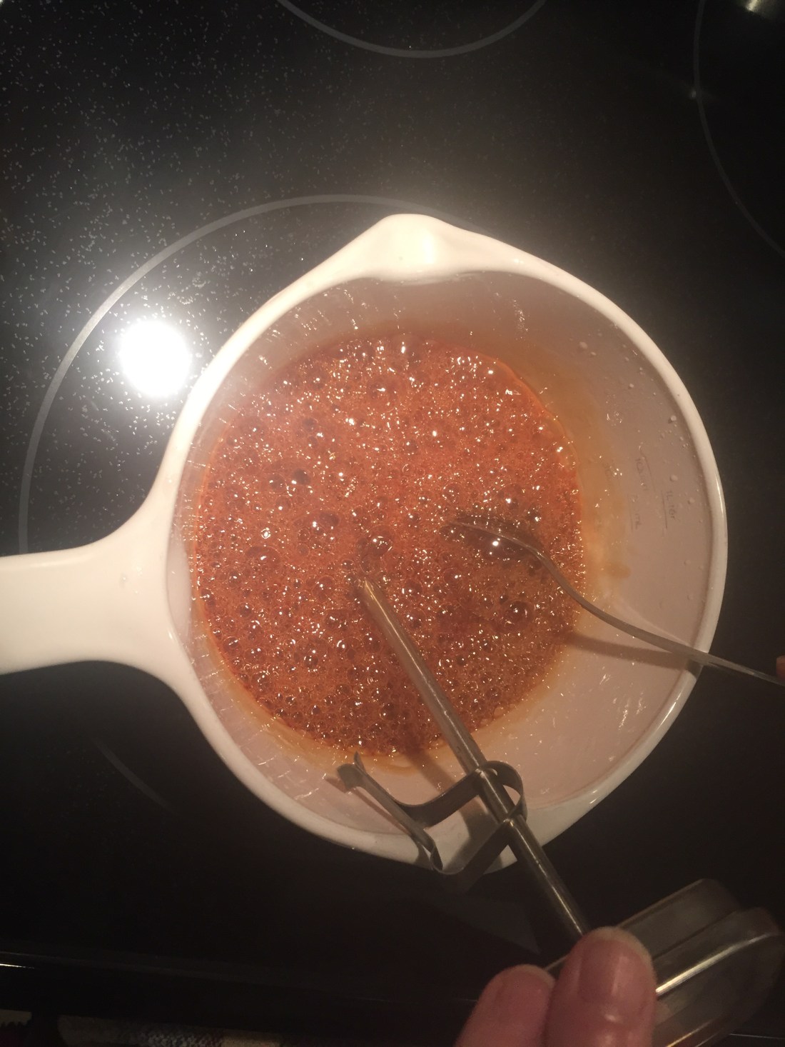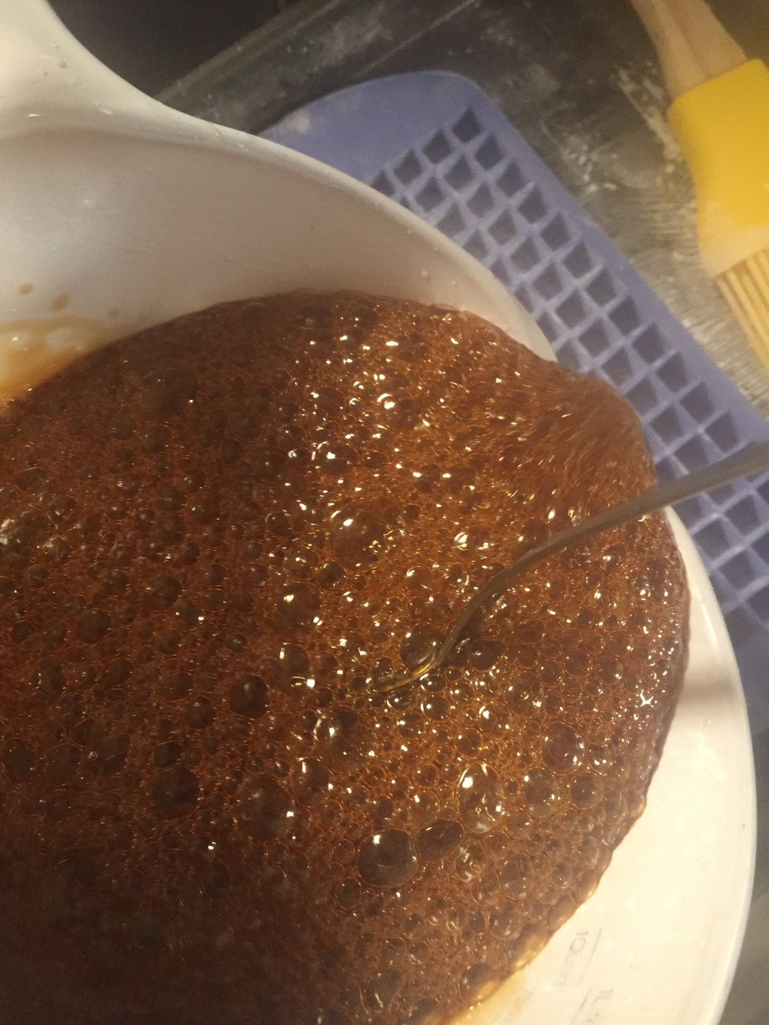 I love how the bubbles start to turn glassy looking as the liquid is boiling out! Basically we are reducing that initial 2 cups (sugar plus water) back down to 1 cup while keeping it in molten liquid stage to make candy! Even tho I’m using a candy thermometer to tell me when I have reached hard crack stage (continuously stir people!) I use the old tried and true church lady method to test if it’s ready to be candy by dropping a tiny drip into some cool tap water and then testing to see if it’s hard or still a bit gooey (it should be hard like hard candy, not gooey and by testing… I mean eating lol)