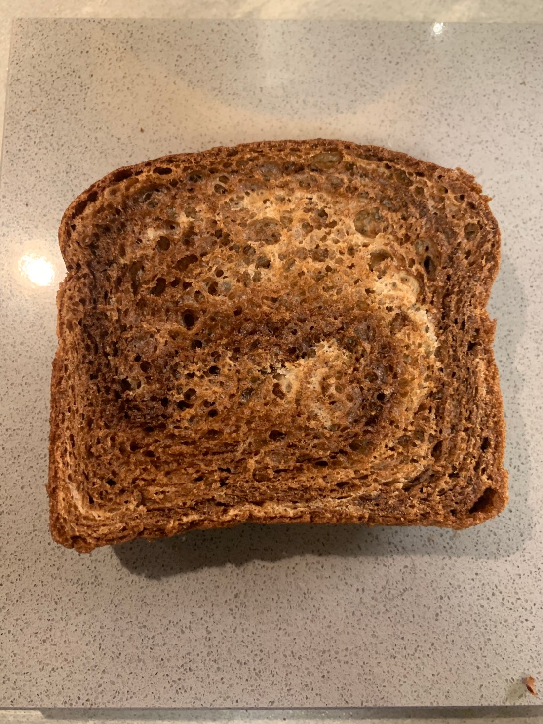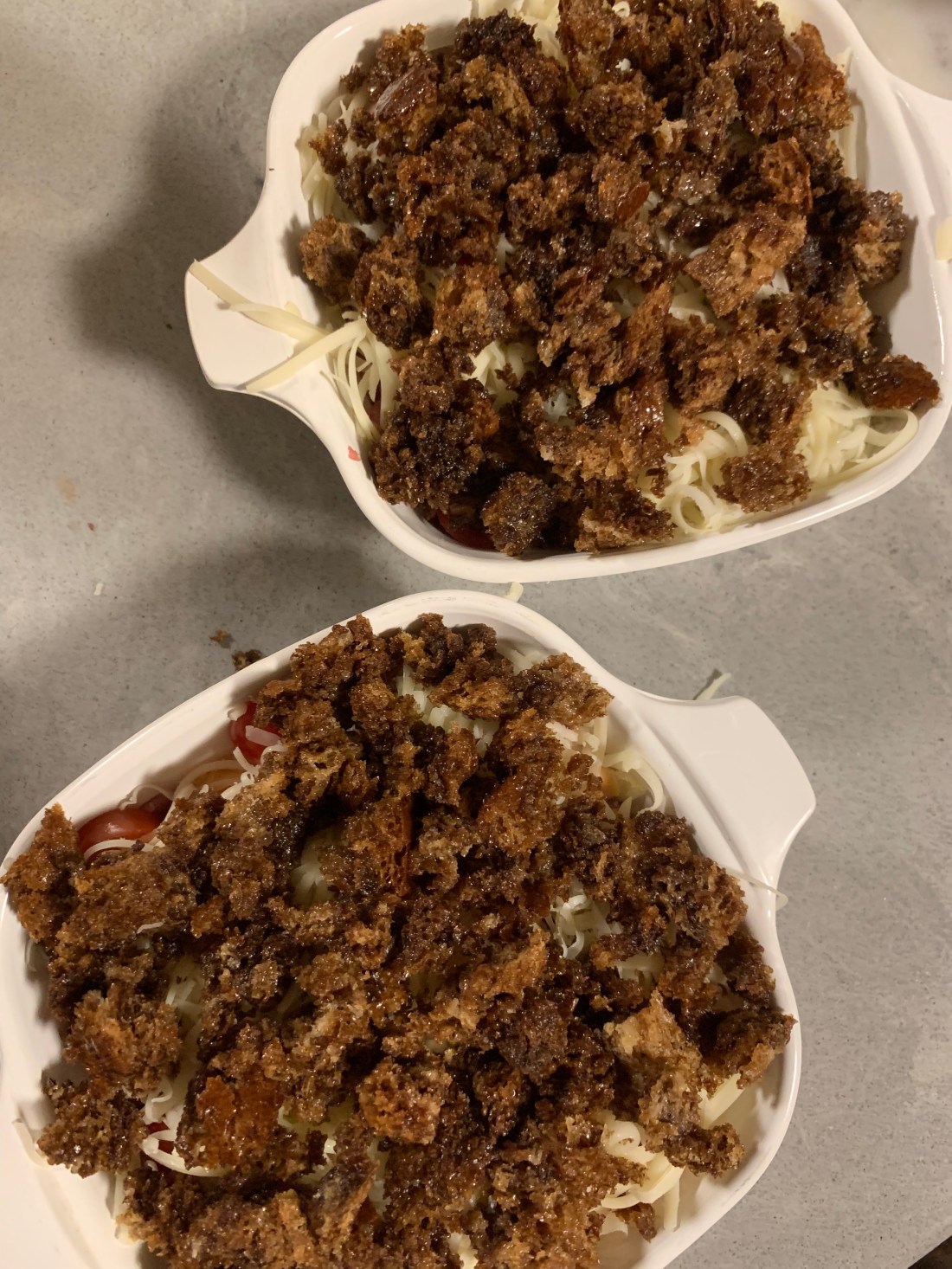 Then take one slice of rye bread and crumble it up and toss it in some melted butter.