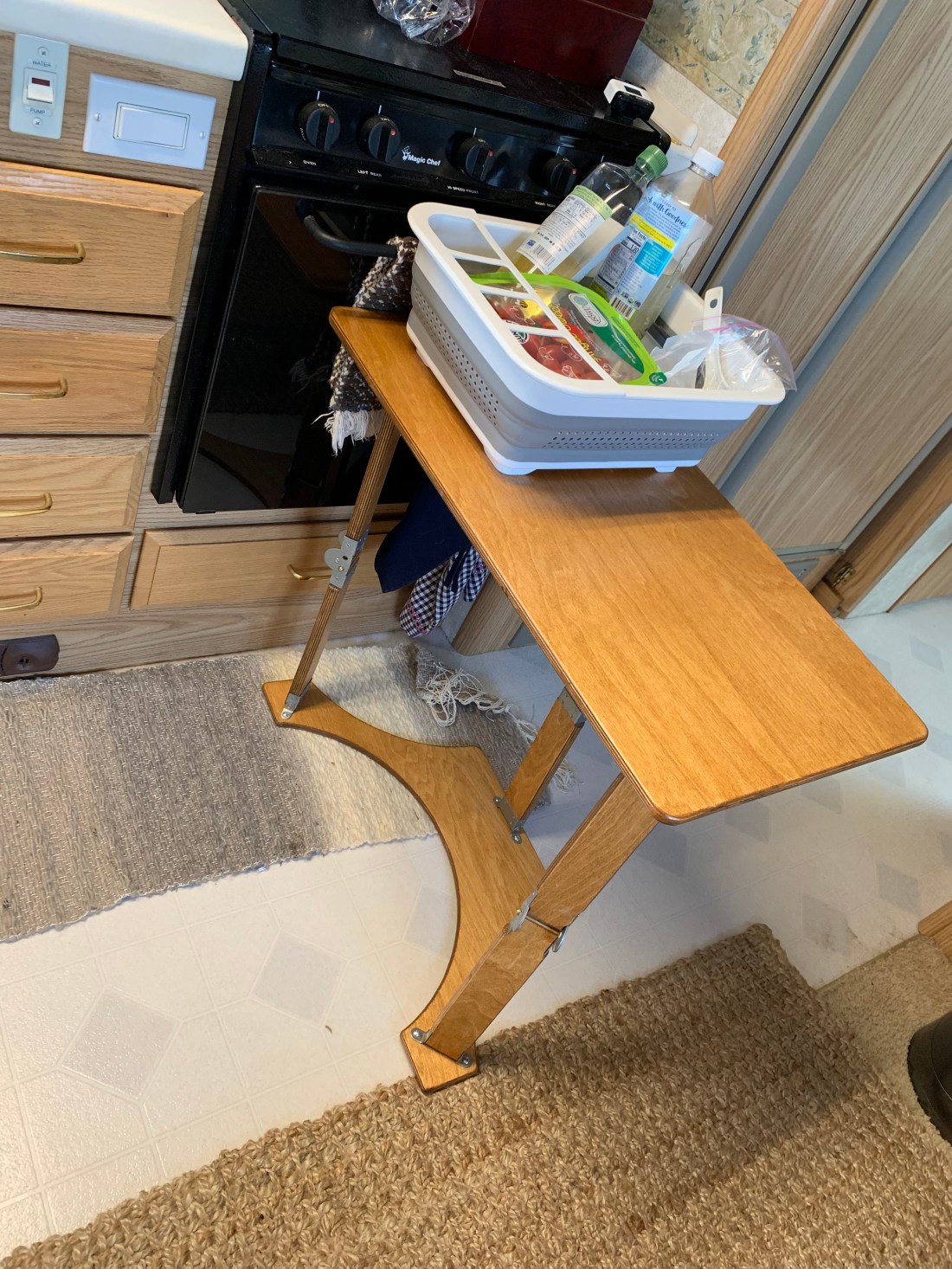 I also thought I’d talk a bit about some really handy RV items that I just love! The first is called a spiderlegs folding table (available on amazon). We have used the heck out of this so much that we ordered a second one to have a spare. It works great as a dining table, an end table, an impromptu kitchen island for tiny living lol, a crafting table, and my grandson thinks it’s his special table and chair (we also have the spiderlegs folding chair) when he comes over for a visit at the house and always sits at it to have a snack lol. They come in different sizes and shapes etc but the one in this photo is the laptop table. It folds down flat and I can stow it just about anywhere… often it goes behind a seat or the couch when not in use. I get a lot of compliments and questions about where did I get this table when people see it, so it is well worth the purchase for just about any use you can imagine! Prepare to amaze your friends! (Available on Amazon)