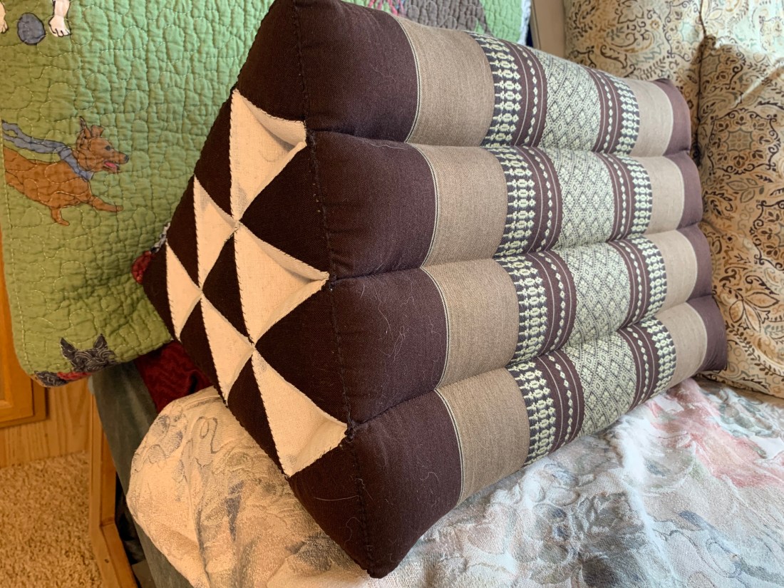Now for one of my favorite finds! This Indian triangular back rest pillow from amazon is absolutely the best! It is very firm and fairly stout and heavy so it doesn’t slide around or mush down when you want to prop yourself up in the bed and write a blog. Since lil bit is the bed hog and blanket hog I can say that she approves of this purchase, so we can snuggle as I write lol… although Conestoga Chuck may not approve so much because we are technically sitting in “his room” on “his bed” lol