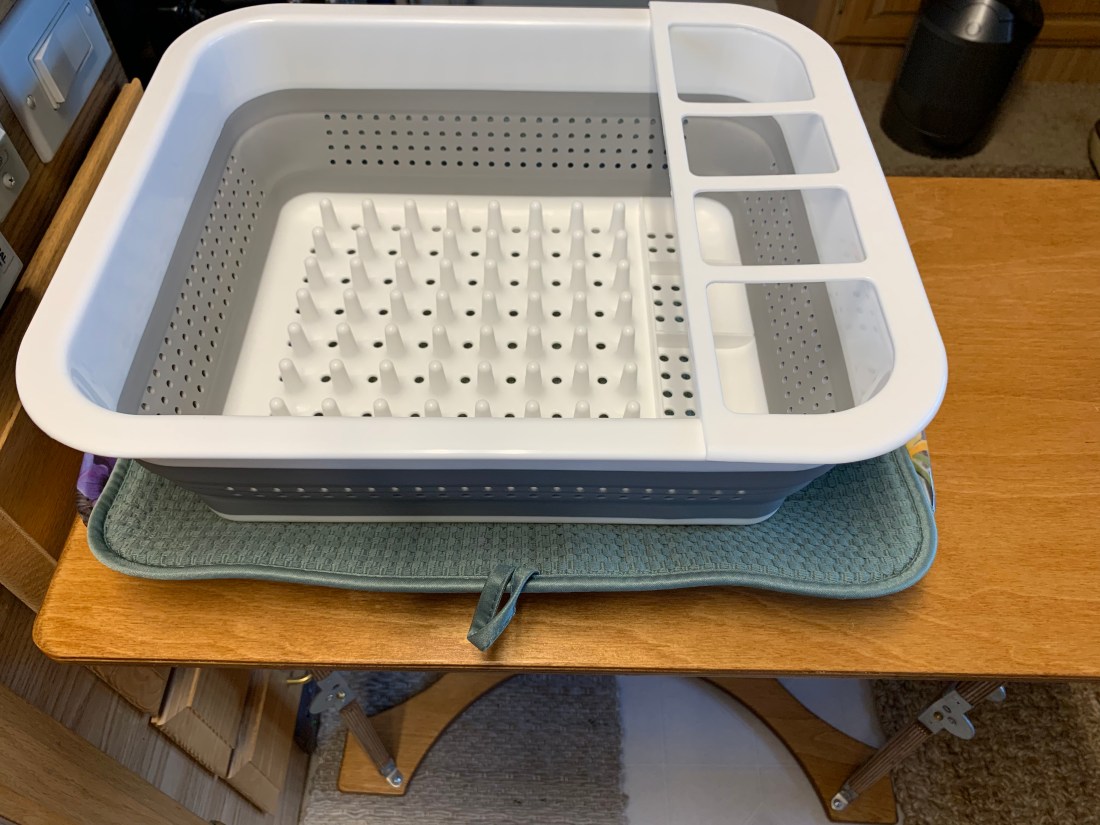 The next cool item is the collapsible dish drainer. We place that on a tray with a drying mat on the tray for when we do dishes, and when traveling we just put it in the sink with things that normally sit on the countertop so they don’t slide all over the place when we are driving down the road. We have the matching collapsible dish pan with removable drain plug that helps to catch any bits and pieces before it goes down the drain into the grey water tank. We usually use a pot scraper to scrape the plates and bowls etc before washing them so honestly there isn’t much “bits and pieces” to worry about after washing the dishes. I honestly don’t remember where I bought these but I’d bet you can find them either online or at an RV store.