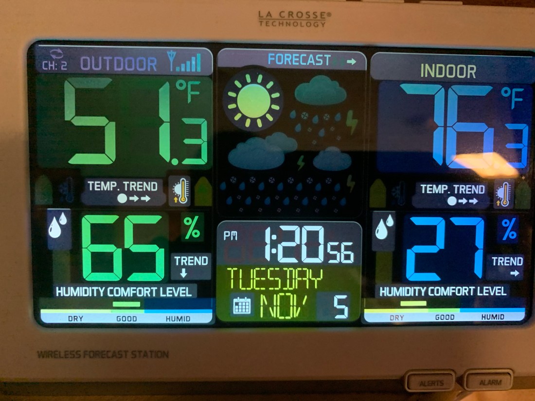But back to humidity control. If you notice… our humidity levels are now at 27% inside the RV compared to 65% outside. Optimal indoor humidity should be no higher than 40%. Lower than 20% and you will start having problems with dry mouth and dry skin etc. So it is a fine balance that needs to be maintained.
