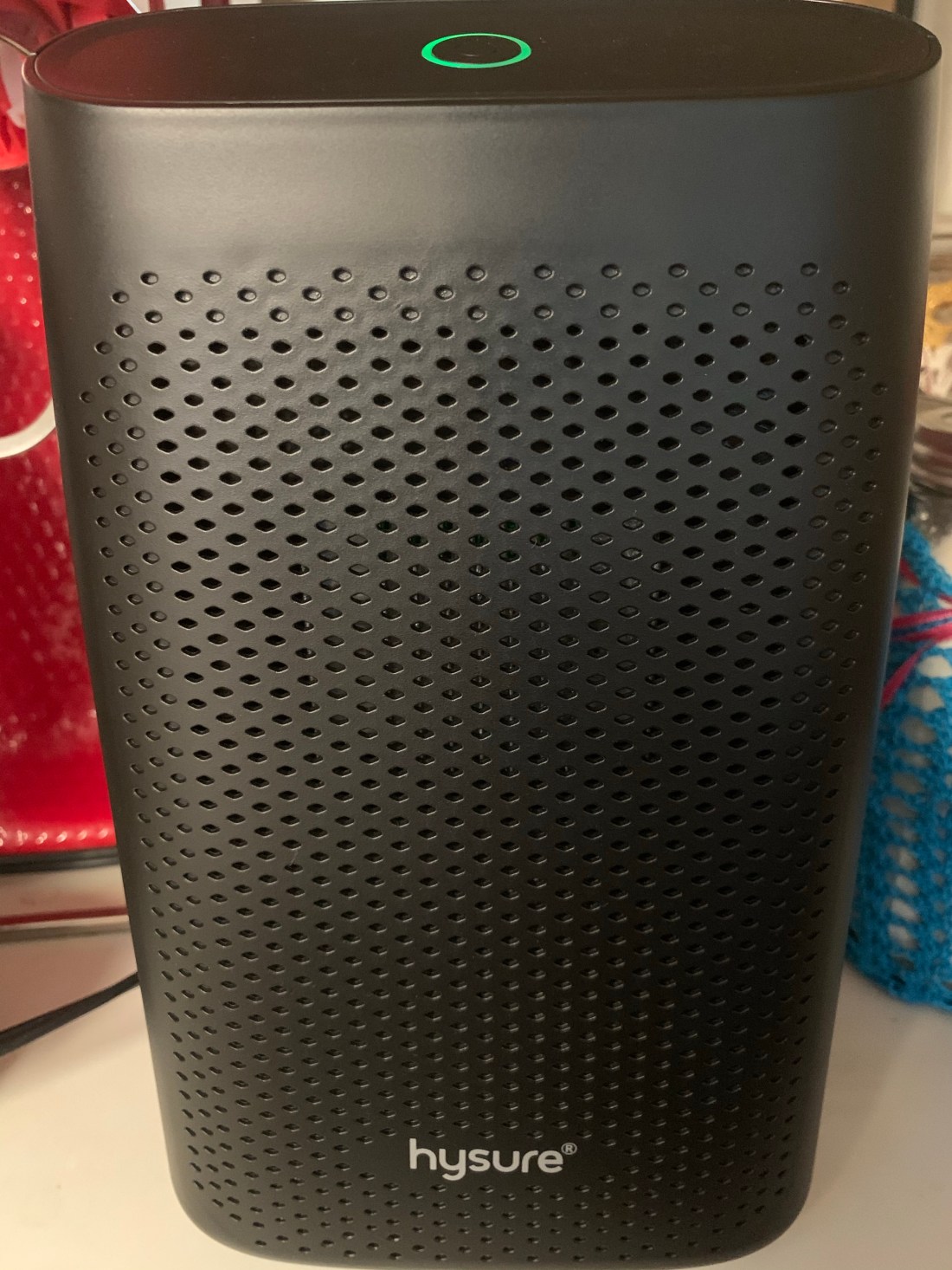 So …trying to stay within those purchasing parameters as best as possible, I ended up getting a hysure 700ml dehumidifier from Amazon. The cost was $39. The item is about the size of a small ceramic bathroom heater, so it fits well in the limited space of the RV. It had amazingly good reviews, and we will add to those reviews that the product works great! Hence the low humidity levels in the RV today. The combination of the fan circulating air plus the dehumidifying attributes does a bang up job in our 36 foot (with slide outs) coach! It is small but seems to work great! It’s really not much taller than a quart size mason jar (which you may be able to see on the right side of this photo although this photo makes the dehumidifier look a lot bigger than it actually is lol) so it sits on the countertop very nicely in the kitchen and it is a very slim design.