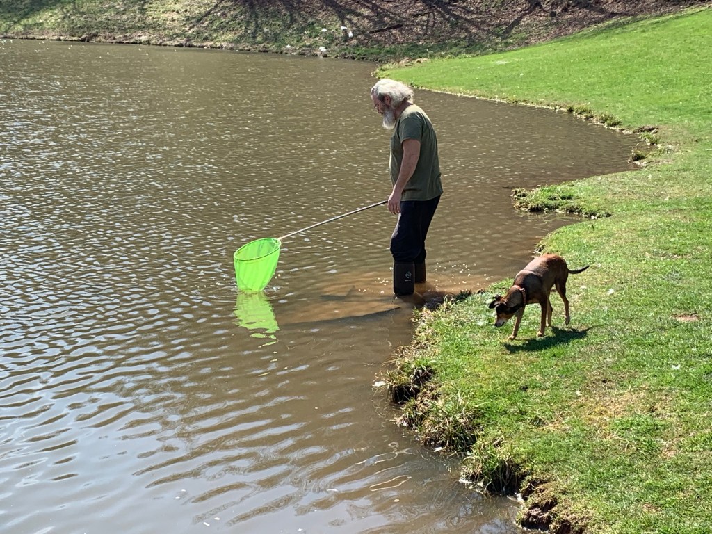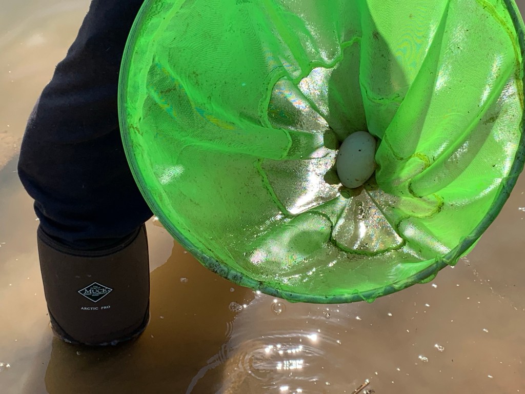 Now for the other bit of fun! They have been laying 4 eggs every morning at the waters edge every day for several months now! In order to make it easier to gather those eggs I bought hubby a present for our anniversary this year lol… a bait net with an extendable pole so he can go fishing for eggs! Works great! Occasionally he has to put on his muck boots to reach the ones dropped a little further out in the water than normal lol like today!