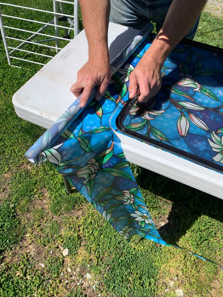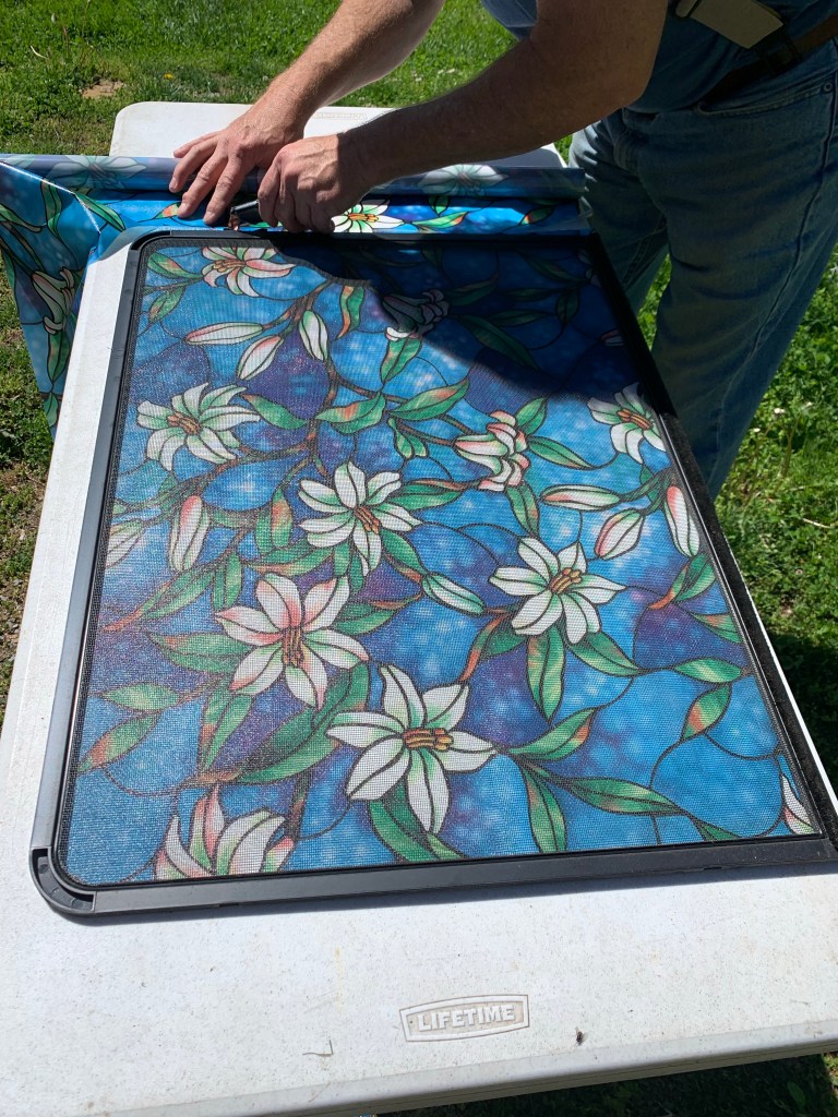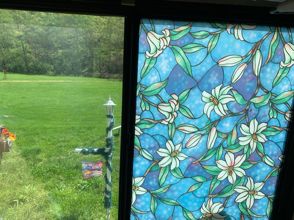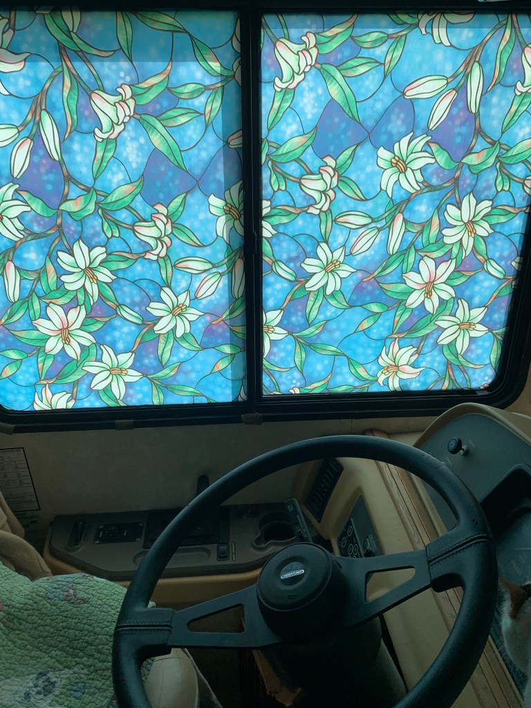 For our RV we simply removed the window screens and used those as our template to cut the film. Then trimmed it once placed on the window. Be sure to pay attention to the trimming and placement where the windows slide open… so when you open the windows they don’t snag the film and pull it off. If placed properly you should be able to open the window with no problems. You can also label these with a magic marker so you know which window to put them on when you take them down and go to reuse them the next time. They are very nice for areas that are traditionally hard to put shades such as drivers and passenger windows and door windows. I like the stained glass look. They block a tremendous amount of thermal heat but still allow for diffuse light so you don’t feel like you are living in a dark bat cave such as with using the traditional thermal curtains, pop up window screens and blinds etc.