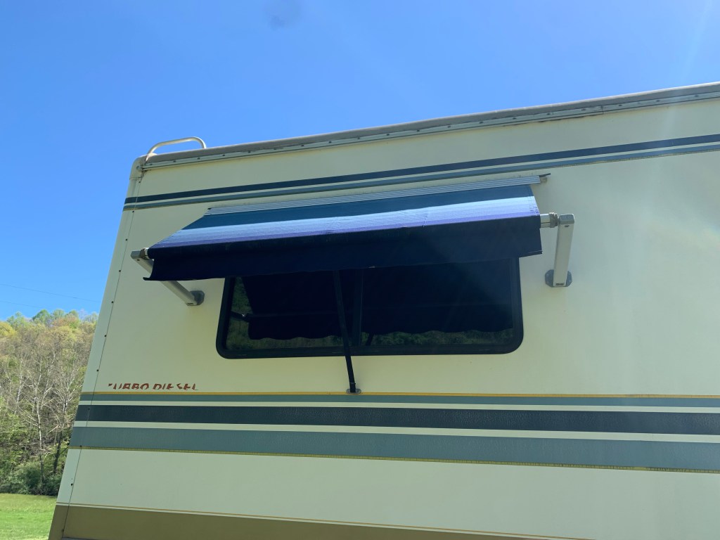 One of the challenges while living full time in an RV is balancing the love of having lots of windows against trying to keep the RV cool during those extreme high heat summer days. My dad owned this particular RV before we bought it and he installed small awnings over all the windows that were not covered by the big awning. These are a huge benefit because you can still use the windows to enjoy the scenery during the day and they are shaded so it helps tremendously in keeping the indoor temperatures much more enjoyable! These small awnings are well worth the additional expense!
