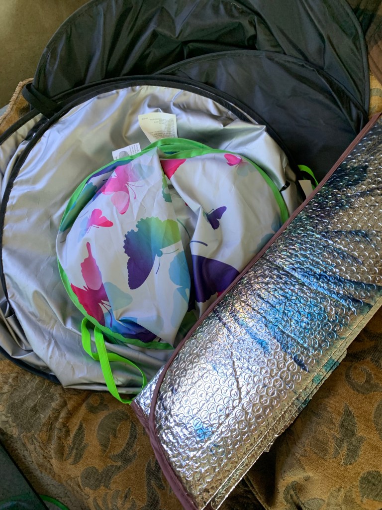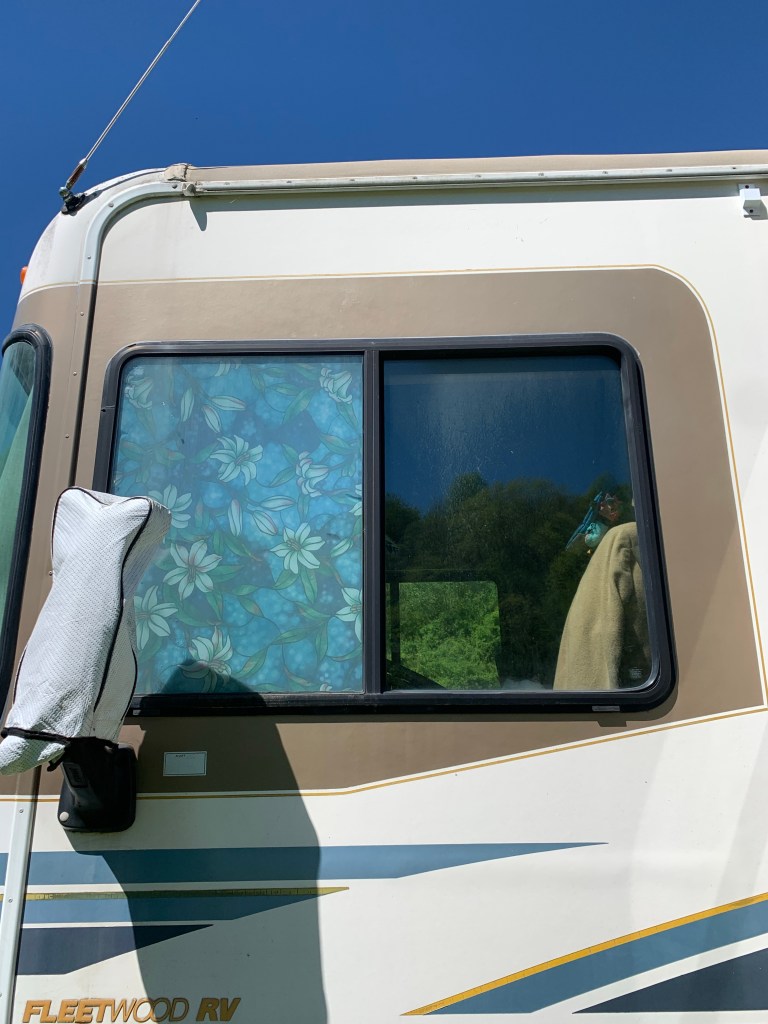 However, there are windows that one can’t not simply add an awning, or the cost may be too prohibitive to do so. Thus we have a secondary solution. We have used this solution at our home before as well as in our other campers and it works well and is cost effective. We purchase a roll of window cling film which you can buy in hundreds of sizes and styles from hardware stores and online at places such as Amazon. You simply cut the cling film to the size of the window, use a spray bottle of water to apply, and a credit card to work out any bubbles in the film…then you are done. It’s fairly simple and it is removable and reusable. Make sure you purchase the cling kind and not the permanent affixed kind of film, as there are two different types of this product. This is obviously for long term parking. Use your normal curtains and mini blinds for short term parking… but for a long term parking beautiful solution, this is fabulous! For short term parking we have a pile of tradition window thermal blockers that we use in conjunction with the factory affixed curtains and mini blinds. But those become cumbersome if you want to look outside or open a window for a short while to enjoy a fresh breeze in the morning. Not to mention Conestoga Chuck does not approve because he has to have a window to look out as well!