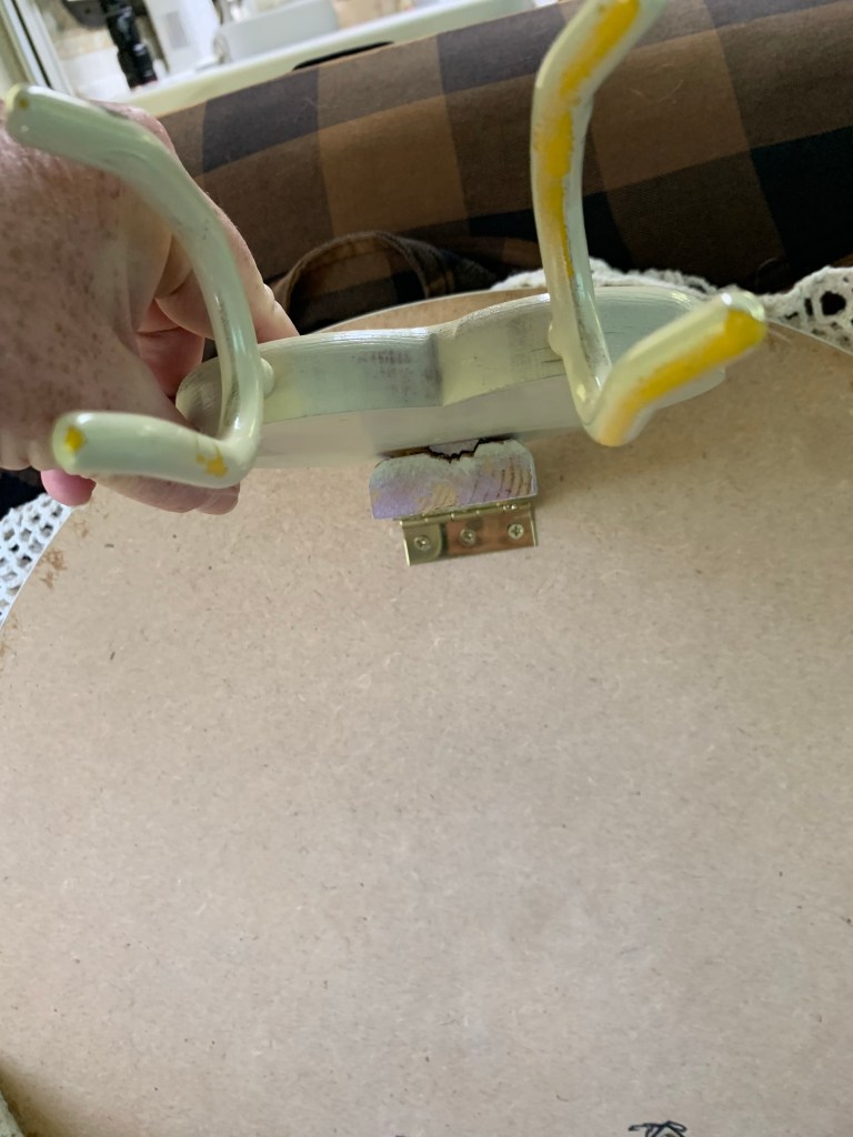 I have to give my dad credit for this little invention, as this was all his idea. This little table has been in use for 20+ years now and holding strong! It’s very easy to make and relatively inexpensive too! I do have to be careful not to put a super long table cloth on it because the drivers seat is Miss Kitty’s favorite napping spot lol she will pull the cloth (and everything on the table) off with her claws if she does not approve. Otherwise I would recommend a longer tablecloth… we use doiles and such that we find at a thrift store so if Miss Kitty does decide to claw then it’s no big loss. We also cover the back of the chair in a camel hair mens dress jacket since it looks nice but also prevents clawing of the leather seats! A nice $1 find from the local thrift store.