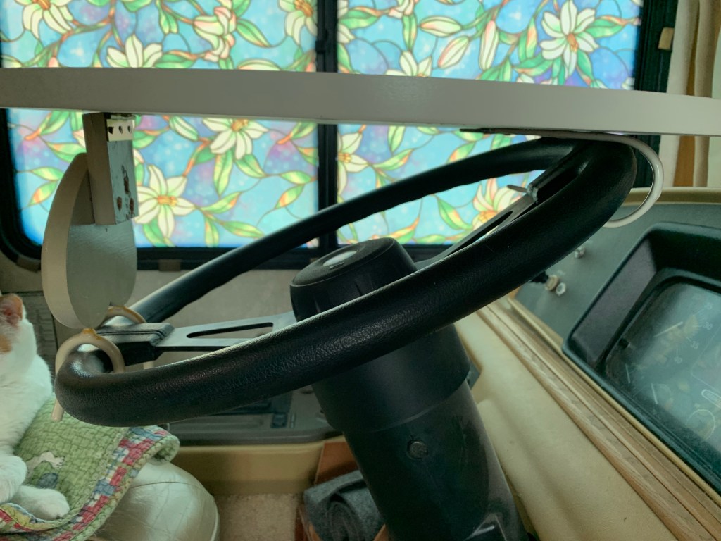 We started with our steering wheel tilted fully in the up position and then build the table because we wanted more room next to the captains chair. When dad made this table he used it as his coffee table to sit and watch TV or to look out the dash window in the mornings to enjoy the scenery. Now that we have taken over the RV Miss Kitty has decided that this is now her chair and everyone else can go find someplace else to sit lol. Conestoga Chuck and his sister are usually hogging the other seats (not to mention those pesky humans) so a cat has gotta claim a space for herself!