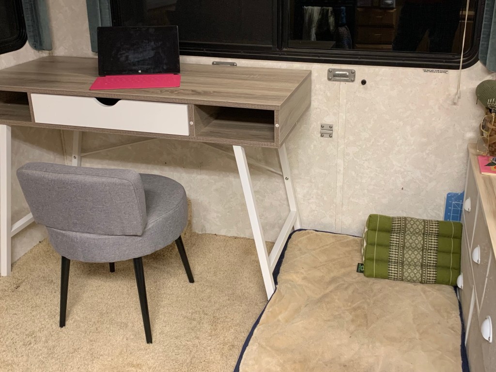 This last photo is just another quick view of when we first installed the table, storage unit and puppers bed after removing the dinette set. The chair is awesome! We love this set up so much better than the old set up! I think the desk was actually listed as a TV stand lol and the matching storage cube was listed as a bedroom storage unit… so get creative and take measurement to see what will fit! Then make sure the chair is not too tall to work with what you have chosen.