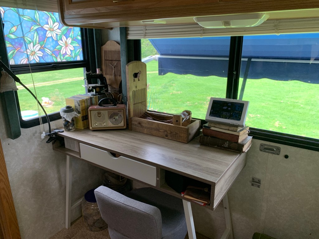 One of the things we did first was to remove the RV dinette set and replace it with this small desk and chair set and a matching storage unit that also serves as a coffee table beside the couch. If you are a crafter or work while traveling this little modification has been a really nice one. We found the desk, chair, and storage unit on amazon which was easy to match design and space limitations while shopping from the comfort of the RV. On the floor between the desk and the storage unit is the obligatory dog bed for Conestoga Chuck and his little sister to share for nap time. As a family (including the puppers) we all enjoy this easy DIY modification!
