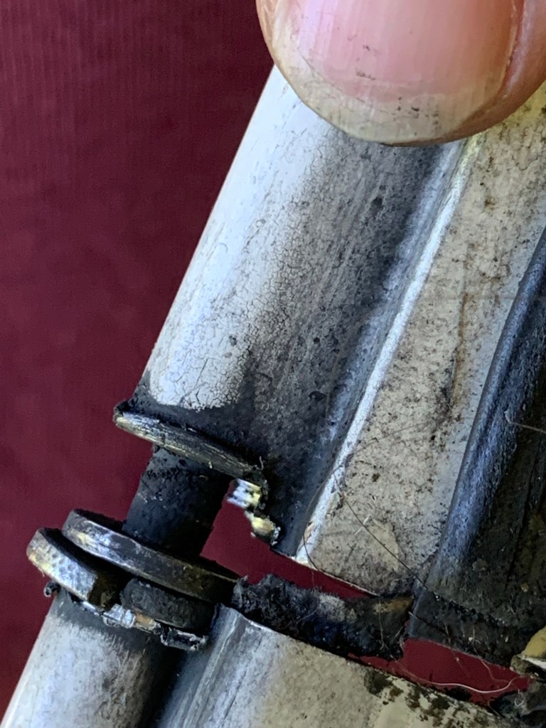 As you can tell by looking at the new hinge after it was installed and comparing it with the old hinge… there should be no gap! It should be a snug but easily movable space, but totally not a 1/4 “ gap! Adding the washers helped for a while but the gap kept getting worse… so replacement of the hinge was necessary.