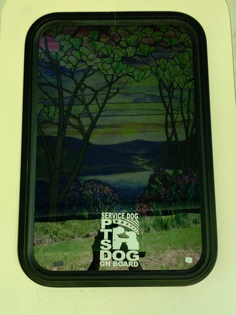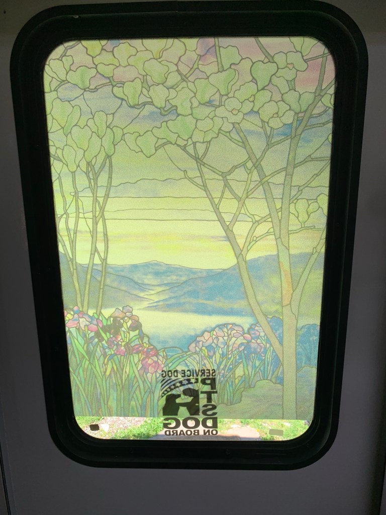We decided to order something a little special for the door window since it is directly across from the couch and is usually on the hottest side of the RV. Even tho we have a very nice awning, there are some days you can’t use it… for example just too windy!… but that door window just radiates heat! It also doesn’t allow a lot of privacy when someone steps up to knock on the door either! So we found this beautiful window cling and decided to go a little fancy on the door window!