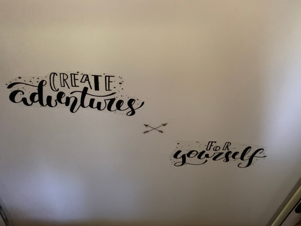 Another fun thing we did for the door is a $1 decor we picked up at the dollar tree. It’s a wall sticker that is removable and doesn’t leave marks when removed. I like to decorate with these and at Christmas you can order a Christmas tree wall sticker that is like a post it note for stickiness (removable) for decorating the RV… which means having a “tree” and not loosing any living space! These removable wall stickers are inexpensive and a fun way to decorate if you get the bug to do something different without putting holes in the walls. I placed these on the door under the window to give it a bit of “bling”!