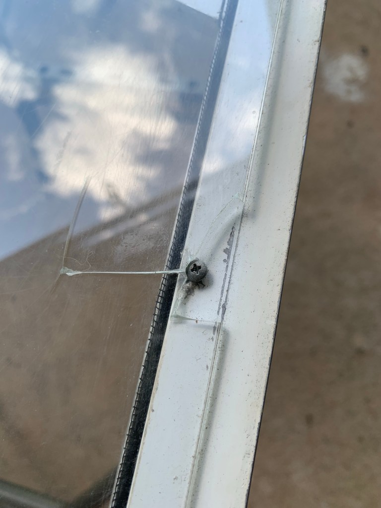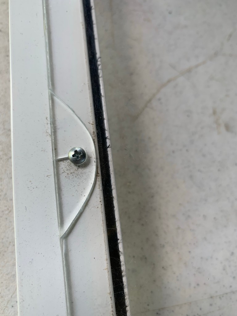 We decided this time we wanted a darker shade of window screen. More of a sun blocker for those days when we have to have the awning up. We also decided to place window screen only on the top portion of the door (no plexiglass like dad had previously installed) so we can enjoy those nice breezes. We also want to go with a new thicker plexiglass on the bottom for doggie paws indicating they need a potty break. We will be making two purchases for this door. A new plexiglass piece for the bottom (with screws and washers etc) and a new slide handle cover. the slide handle cover as you can see has deteriorated and cracked and become riddled with cracked out holes due to heat and age, so time to replace that as well. The slide cover is a relatively inexpensive replacement part, but finding the exact one that fits your door can be a bit tricky. We ordered one from Amazon that said it would work and … nope not the right depths for the door handle. So we found a place online that we think has the correct one, now it’s just a phone call to confirm it will fit properly before we order. These sliders cost about $15 give or take, so not too bad.
