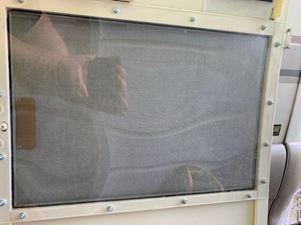 Likely you have read the two previously posts already and know we full time RV in a 20+ year old coach that was previously owned by my father. When he first purchased the coach he decided that they liked to have the outer door open to look out of it like a window, but all the other windows closed (and while running the air conditioner). Unlike dear ole dad we like to have all the windows open to enjoy those cool breezes as much as possible! So we are going to modify his original modification to the screen door. Sorta kinda…. Lol