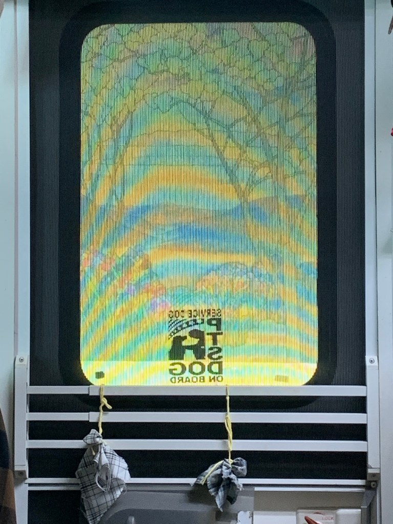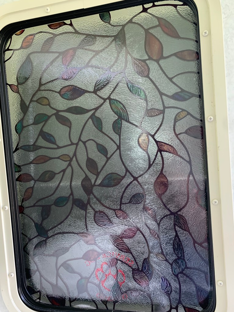 You’ll notice we left the screen on the door under the plexiglass because this will help keep the bugs out! We really did the plexiglass on that RV because Lil Bit and Conestoga Chuck are both trained to paw the door if they need to go out. If you have a plain screen (no plexiglass cover) and a dog is pawing it (or a kid pushing on the screen) that screen is going to need replacing every other day lol. So this was a Conestoga Chuck wagon improvement more than anything! 🤪 and since you already know my love of window cling film I may as well show you the design I put on the door for that RV as well. If you have pets, I also recommend a sticker on the door announcing you have pets inside for emergency services in case of accident etc. that way they know to rescue the pets as well as the humans if you happen to be unconscious!