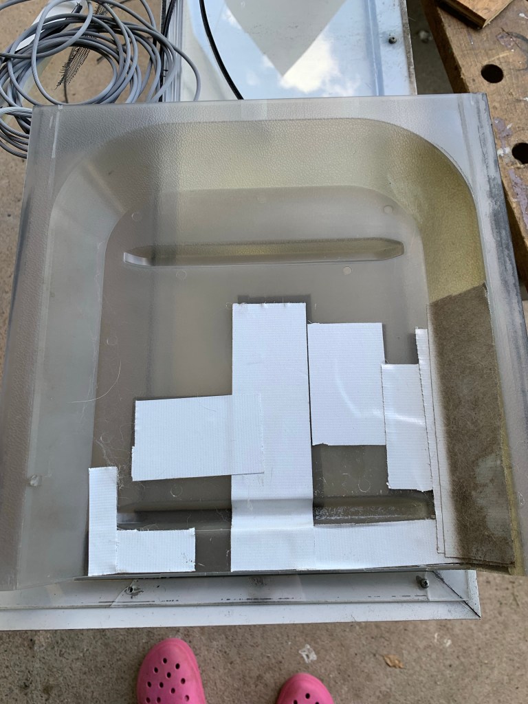 I placed this shop towel under a broken part to show one of the holes that has broken off and is letting in the bugs. I pulled the cloth thru the hole for visual effect. You can also see where the screws holding the plexiglass onto the door have started to crack the plexiglass, which means more holes in the future… so it’s time for some repairs!