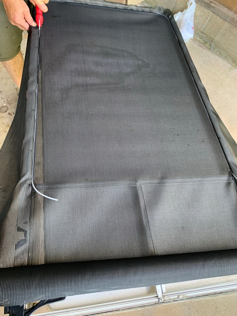 We took the screen door off while replacing door hinges on the main door (previous posts) and now have the screen door on a work table outside to do some repairs and modifications to it. As you can see in the photo, dad replaced all the window screen with plexiglass. But that plexiglass is now 20 years old and starting to crack and break which is letting in bugs when we want to use the screen door instead of the main door.