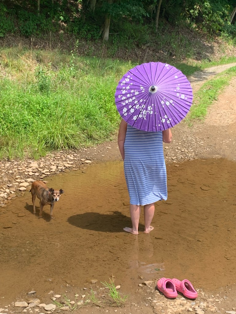 1. An umbrella! If you find yourself outside during high temperatures don’t be afraid to pop out that umbrella you keep in the car for rainy days! Getting under that umbrella drops the temperature on your body by several degrees, provides mobile shade, and keeps you from getting a painful sunburn. You may look and/or feel silly walking around at the local farmers market or where ever with an umbrella on a really nice sunny day… but I’ve found that after I have done so, and then go back the next day… there are tons of people who have adopted my strategy and now have an umbrella themselves lol. After all, our ancestors had lacy parasols for a reason! And trust me lacy parasols we’re not for rainy days! I have a few cloth and paper parasols I break out on sunny days myself! Don’t forget the kids! Give them a child sized umbrella to use! “Lil Bit” often is found walking in the shade of my umbrella on really hot days! Such a smart dog!