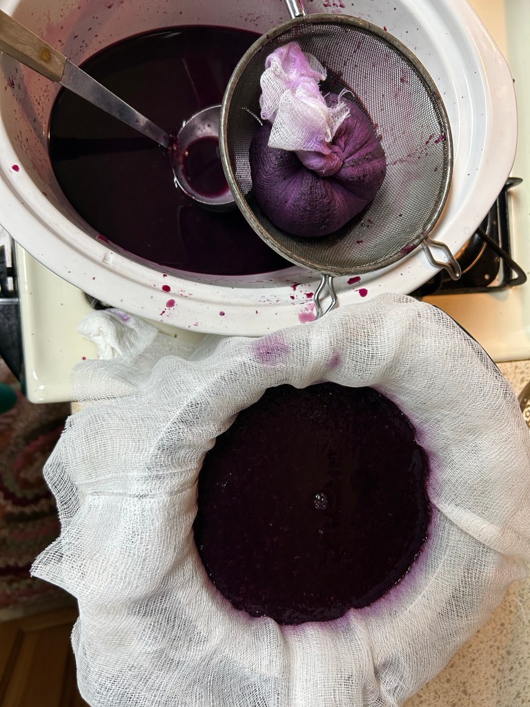 This photo shows the skins dripping from the sieve into the pulpy crock pot juices to get the last drops from those. We ladle from the crock pot (which now has the pulpy juices from the folley mill) into another sieve lined with two layers of cheese cloth which will drip into a tall stock pot. I want the height of the stock pot to give room for the sieve and the juices to drip freely which is why I use a tall stock pot to catch the now beautiful grape juice without pulp.