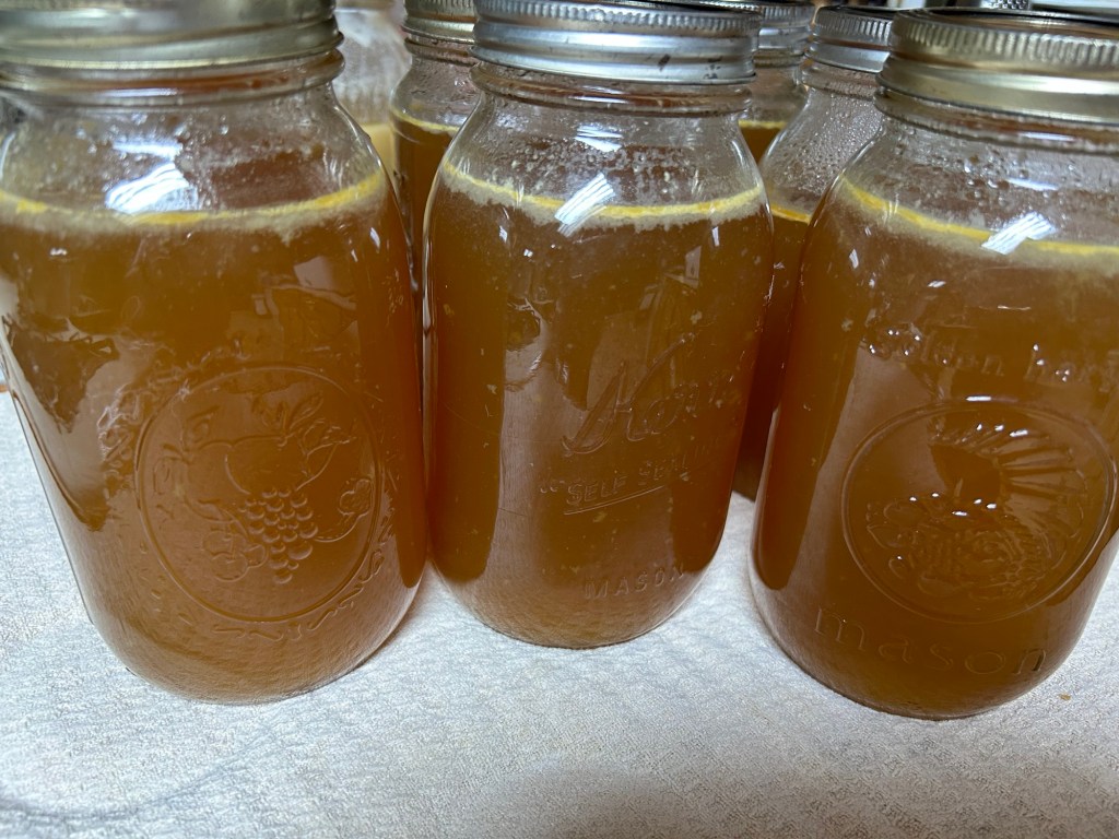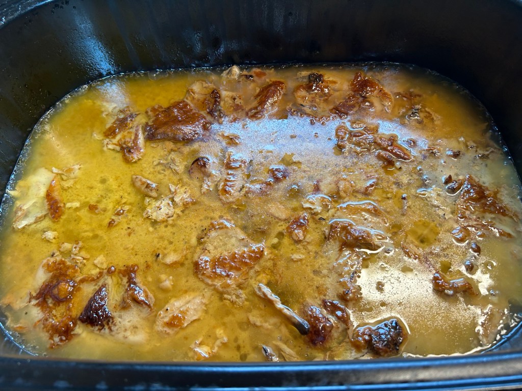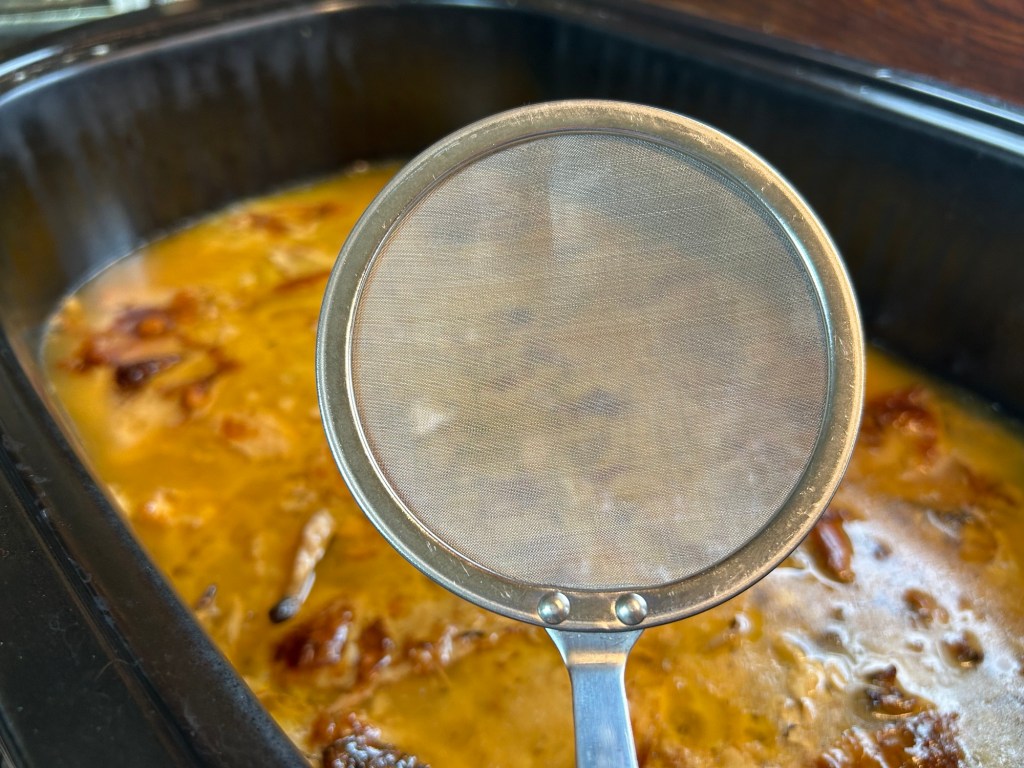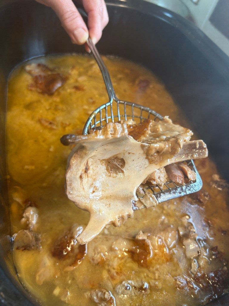 Cover all those lovely bones with water about 1” from the top and add 3 tablespoons of vinegar. We let that simmer for 2-3 days and then using a grease skimming ladle and a skimming spoon (see photos) we remove all the bones, bits of tiny crispies, and floating grease from the top and then place in canning jars and pressure can the jars for 25 minutes for the best turkey broth ever! We also do the same process with beef bones when our neighbor butchers in the fall. We roast the beef bones in the cooker for about 20 minutes then follow same directions as above. This broth is better than anything you can buy in the store flavor wise and it’s basically free! Made from stuff that was going to be thrown out anyway!
