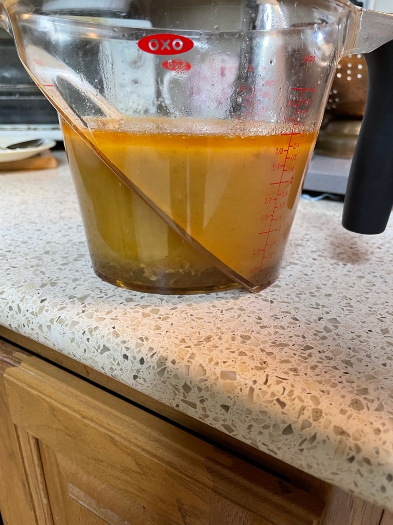 After using the grease separator and allowing the layers to sit, cool, and separate… this is what is left. You can see three layers the bottom layer is a tiny bit of broth, the middle layer is fat, the top layer is grease. By using the special design ladle you don’t loose much yummy broth and can get rid of most of the greasy fatty layer floating on top in the cooking pan.