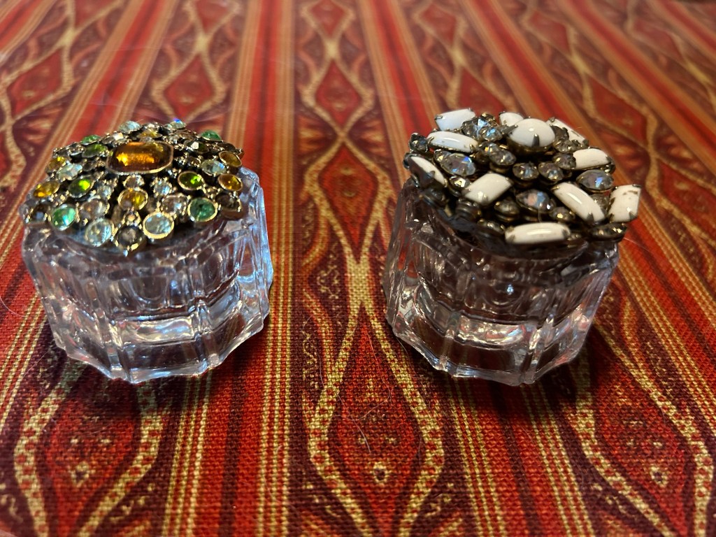 One helpful hint about the broaches… when you pick them out at the thrift store make sure you get ones with the stick pin portion centered in the middle of the broach rather than offset at the side or top… otherwise it won’t fit on top of the salt cellar properly without removing (aka damaging!) the pin from the back of the broach! Save those off set pin, pretty broaches, for other crafts!