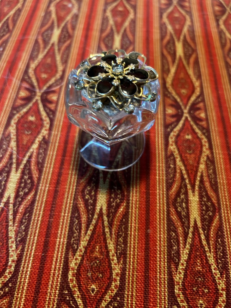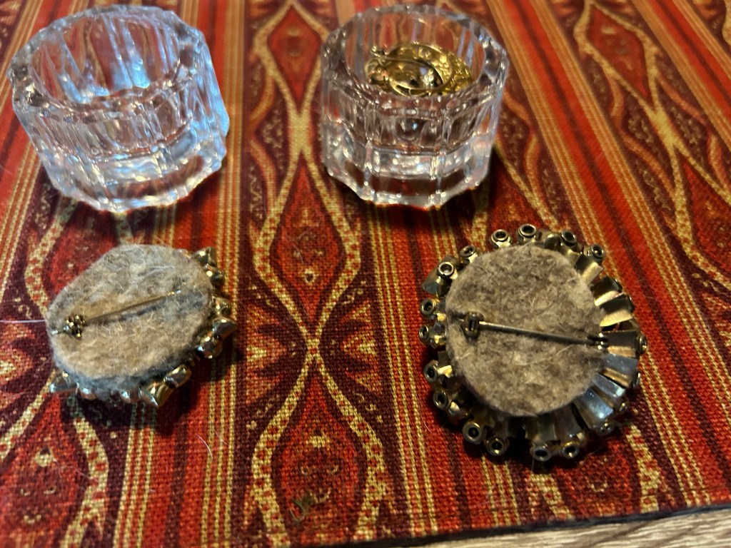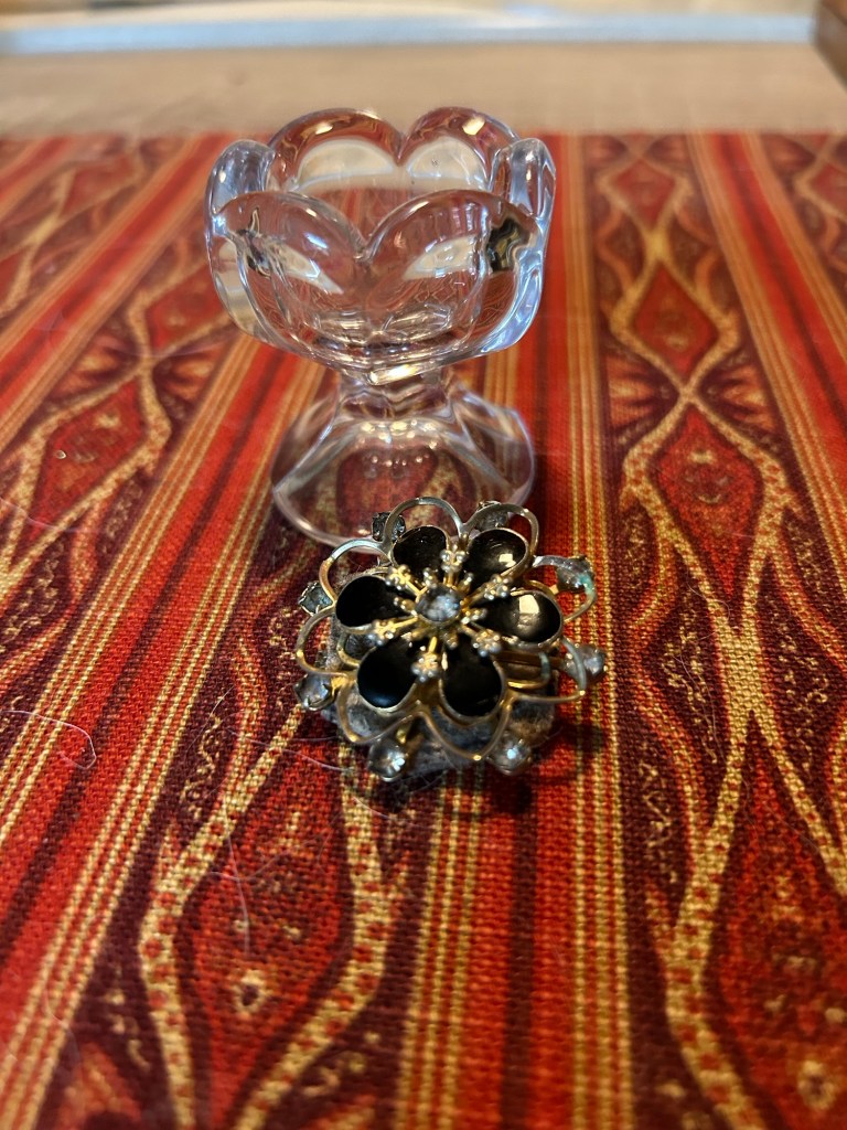 Ahhhhh I do have a fascination with sparkly things lol… I often find salt cellars in yard sales and thrift stores and they fascinate me. They are so pretty! But honestly in today’s age not very useful so I decided to do some upcycling! I also pick up broaches I find pretty at yard sales and thrift stores. I’ve never been lucky enough to find a true valuable antique one (which I would never upcycle with!) but lots of pretty ones that are no longer in style… left over from the 80’s fashionistas! So for 25 cents sure I’ll get them to craft with!